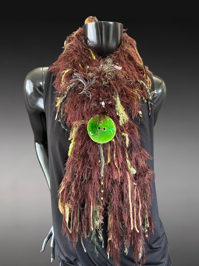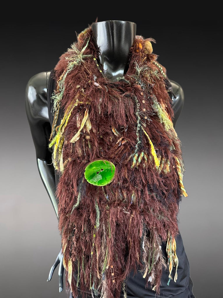 Hand Knit fluffy faux fur short brown and green neutral faux fur scarf with oversized glazed button and hints of beige, taupe, brown, rust and mustard yellows. A great versatile scarf with styling options.