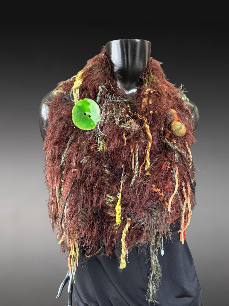 Green Brown knit fur scarf with glazed button, boho style, elfin style