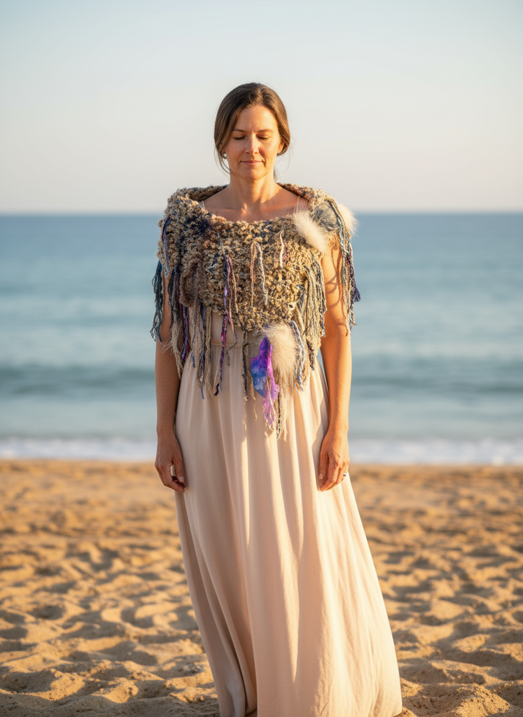 Hand knit bohemian inspired style fringed cowl or shoulder wrap. Colors include beige, cream, hints of jewel tones of aqua, blues and purples. Luxury and premium handmade and artistic yarns and functional snaps on leather in a unique petite tapered cowl or shoulder wrap. Each one is one of a kind. A fun accessory for the burning man, boho style, indie style, huntress, tribal, Stevie Nicks style, renaissance style, post apocalyptic and cosplay styles too. Includes metal embellishments and gears. Finished with a touch of bunny fur. Includes snaps.