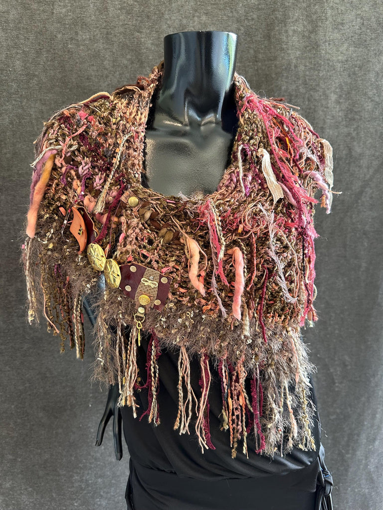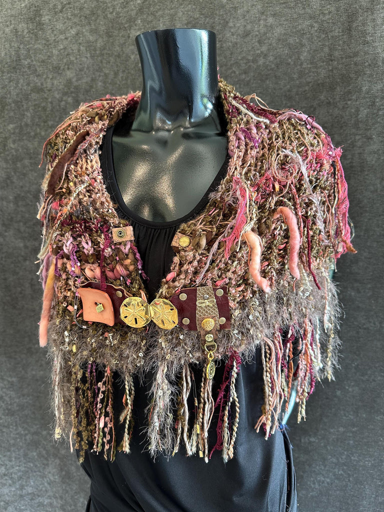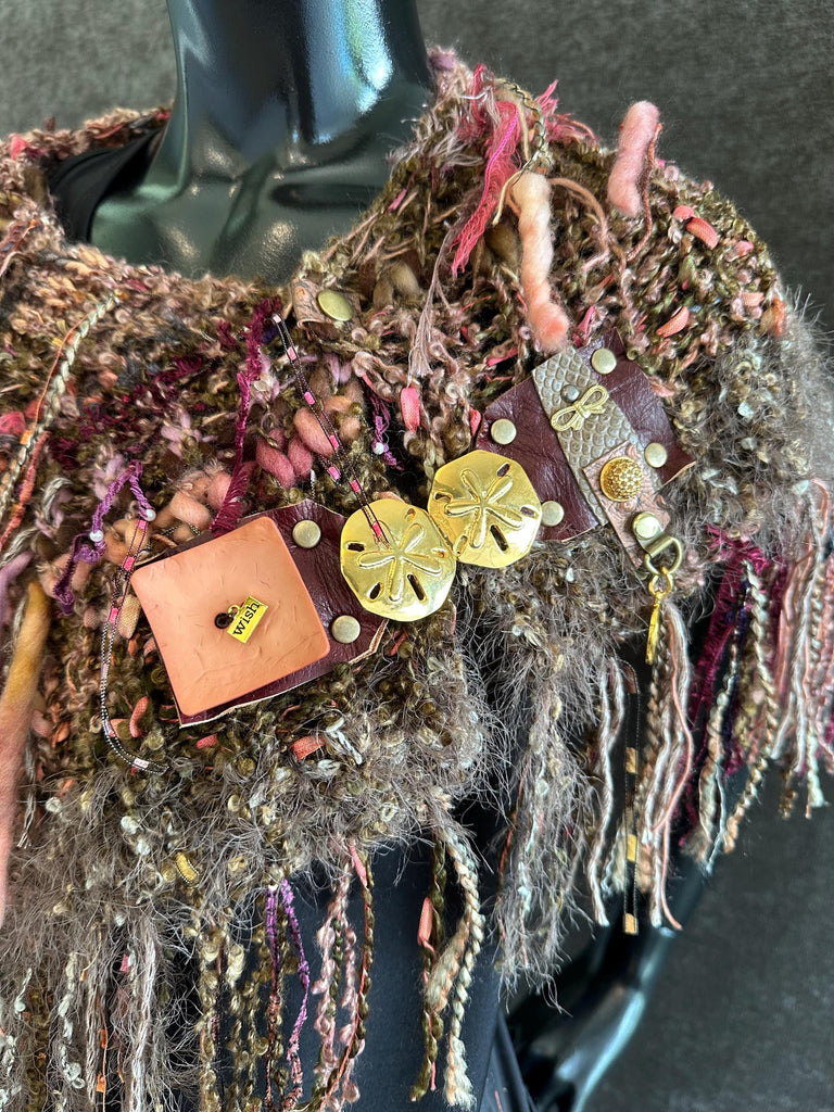 This cowl is knit with a handspun and hand dyed alpaca base fiber, blended with 20+ varous artistic fibers plus edge fringe. The clasp, decorative button and unique embellishments on leather make it a stand-out piece. The unique gold sand dollar clasp is very unique and vintage (though first time ever being used - not upcycled). The clasp has a heavier weight to it, which will make it want to be worn near the lower edge, versus up at your shoulder.