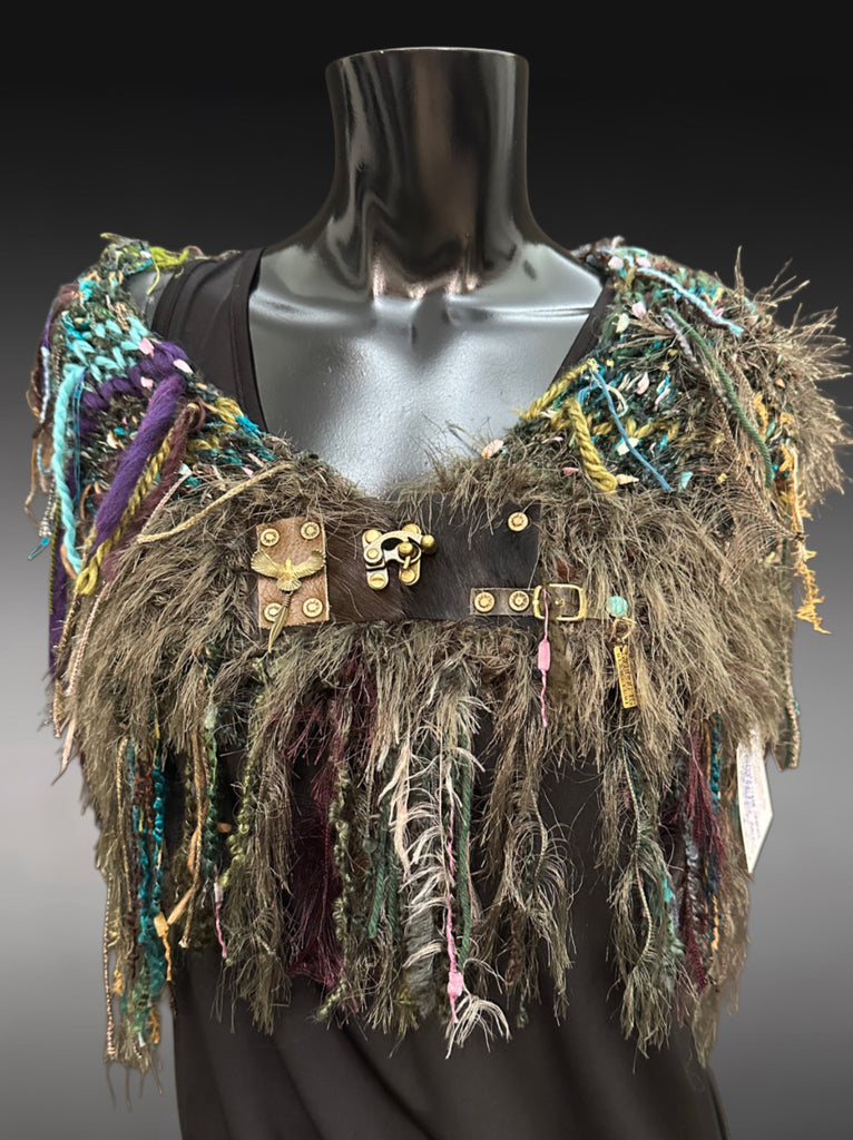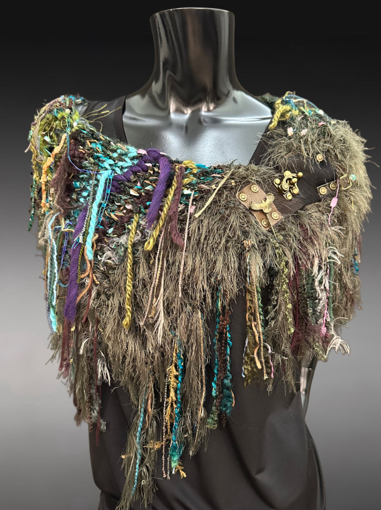 Each one is one of a kind. Materials and embellishments are hand curated for a unique piece. A fun accessory for the burning man too and cowgirl style (great with boots and jeans). Base fiber is mixed with over 18 fibers. Includes minimal amounts of wool.