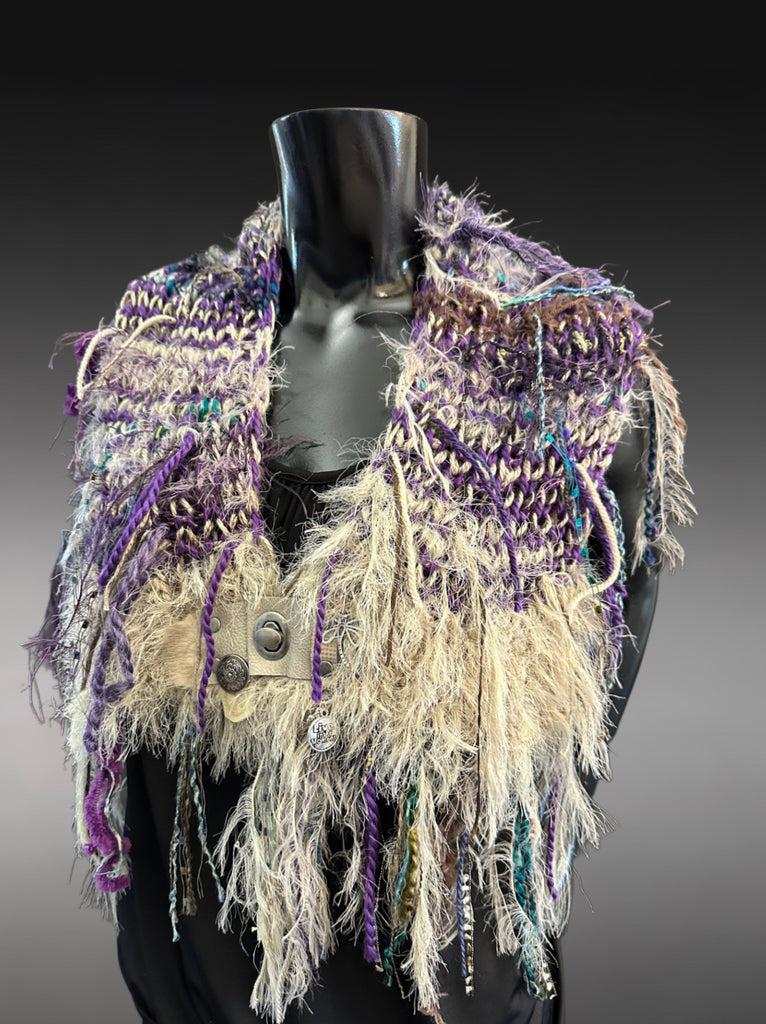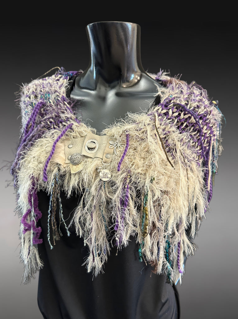 Long textured fringe adds movement and dimension, while the soft structure drapes beautifully across the shoulders like a small shawl or statement collar. A neutral leather clasp with metal clasp and accents secures the piece and adds a unique artisan detail.