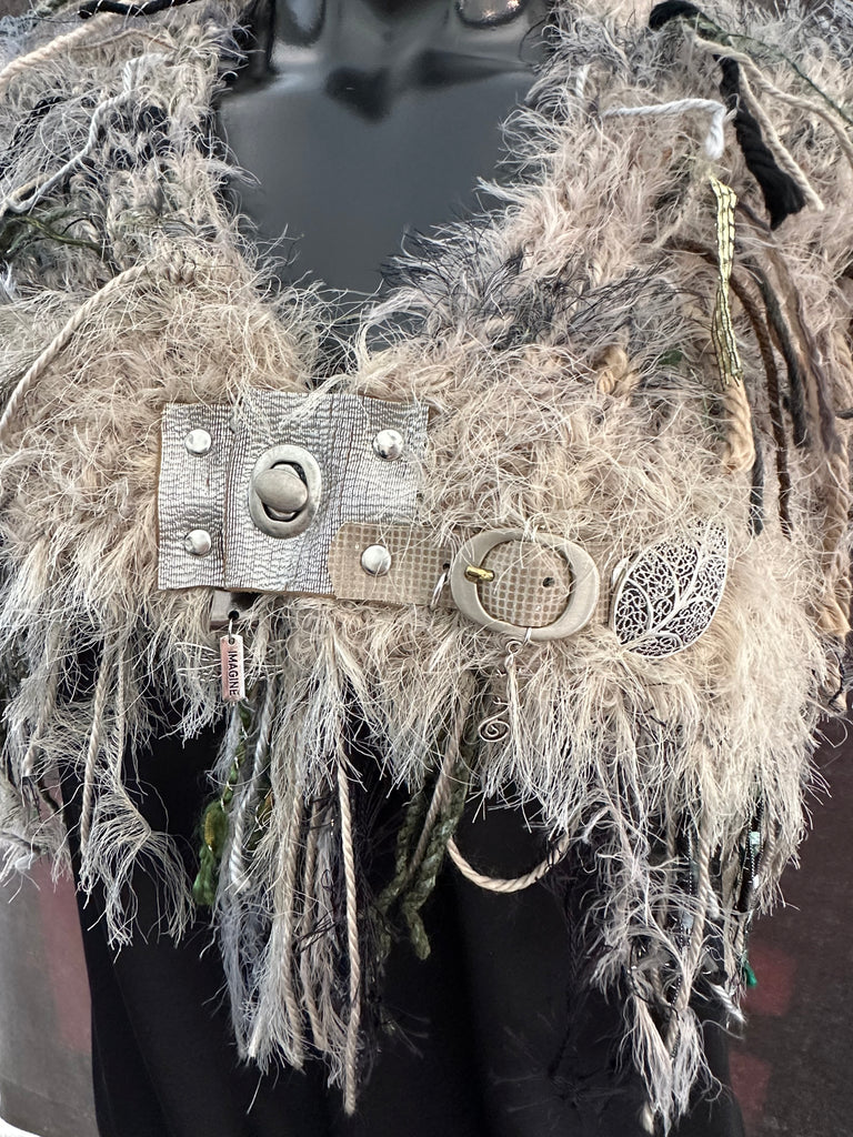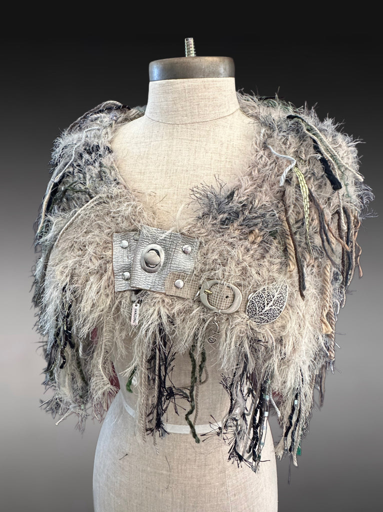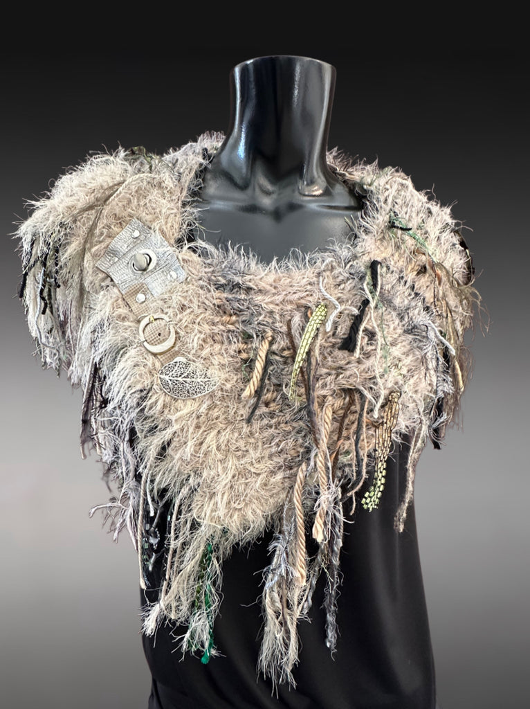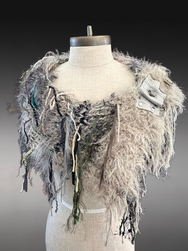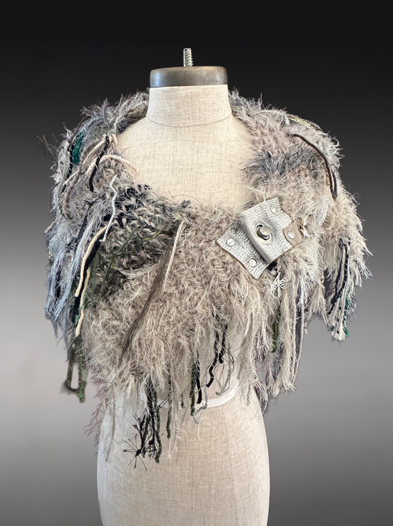 Colors include sage and olive, taupe, black, grays, tan and coordinating shades. Luxury and premium handmade and artistic yarns and functional clasp on leather in a unique petite tapered cowl or shoulder wrap. Finished with a unique large silver open leave detail and buckle. Each one is one of a kind. A fun accessory for the burning man, boho style, indie style, huntress, tribal, Stevie Nicks style, renaissance style, post apocalyptic and cosplay styles too. Includes reclaimed metal embellishments.