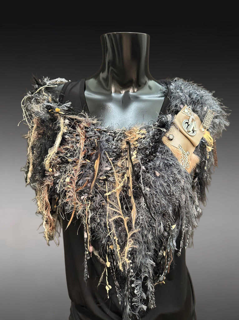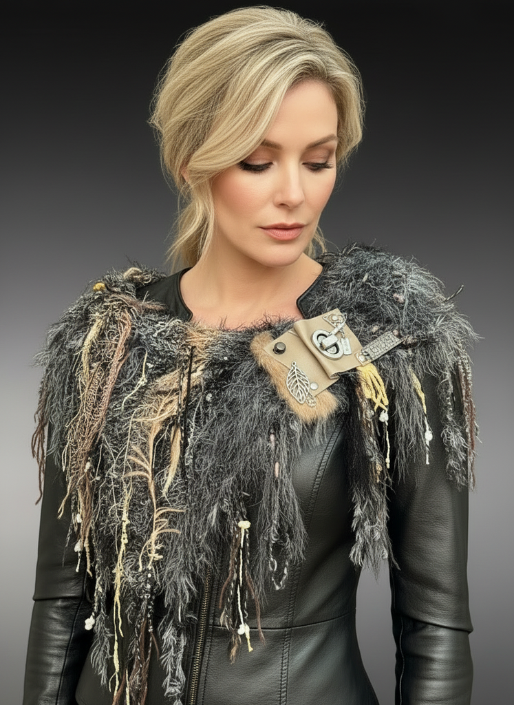 Luxury Textured Fringe Cowl with Leather Charm Detail – Wearable Art Fashion