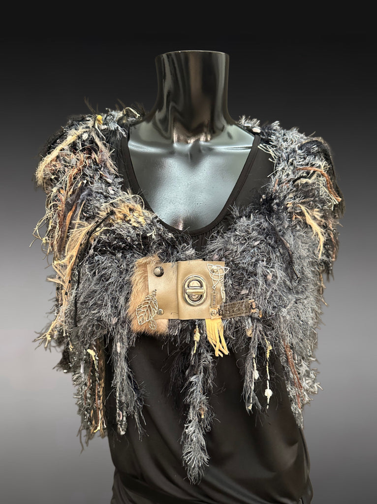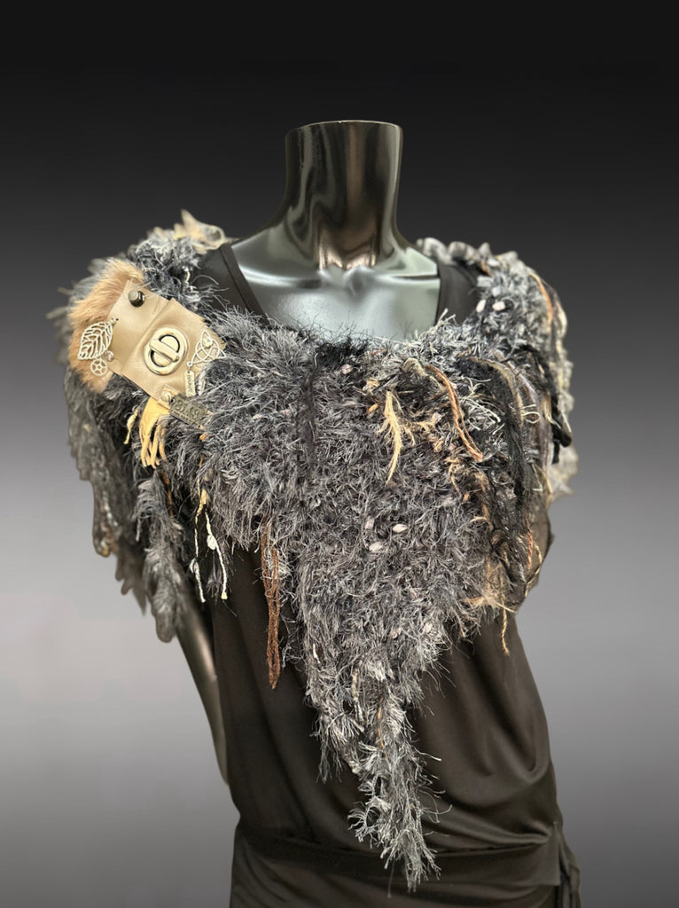 Luxury and premium handmade and artistic yarns and functional clasp on leather with a touch of bunny fur. This is a unique petite tapered cowl or shoulder wrap. This liege has more density and weight to it due to the gorgeous handspun yarns.