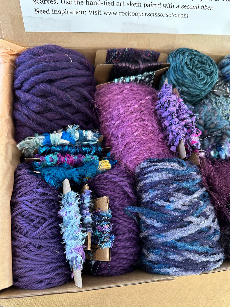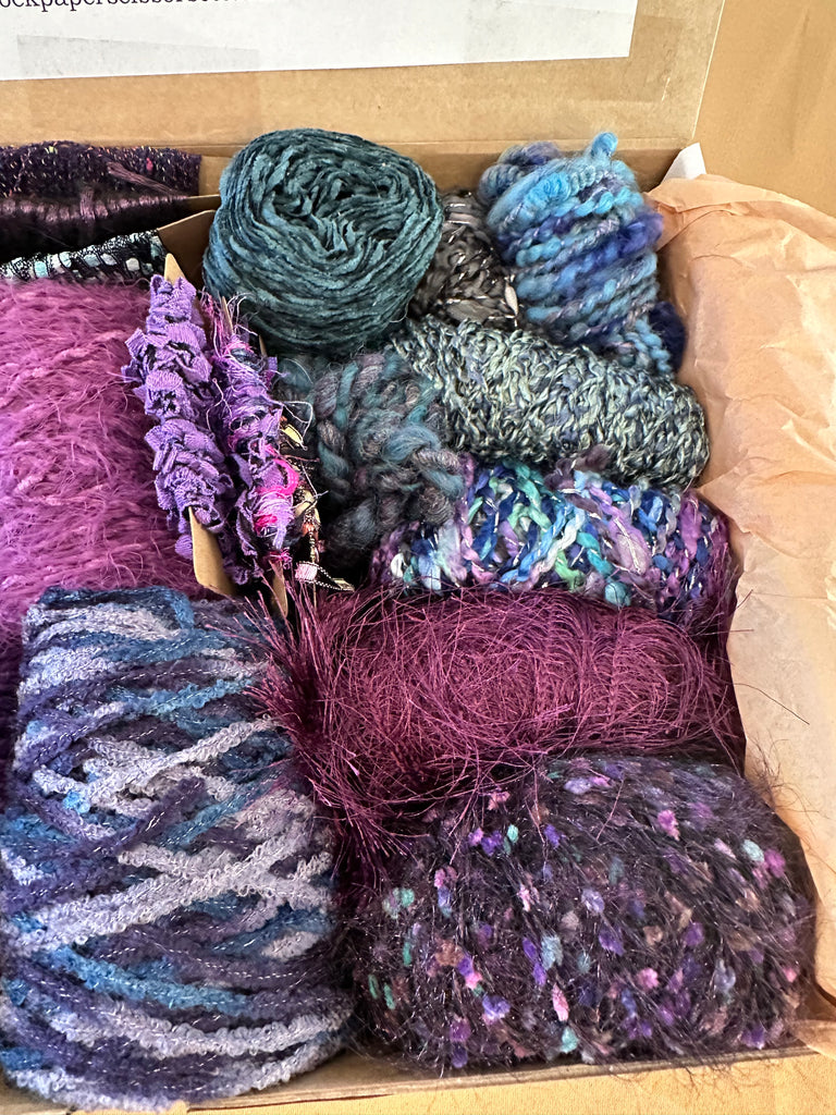 Knitting art yarn bundle, 1.5 lbs, luxury yarn stash box, weaving yarns, bulk purple blue yarn gift box