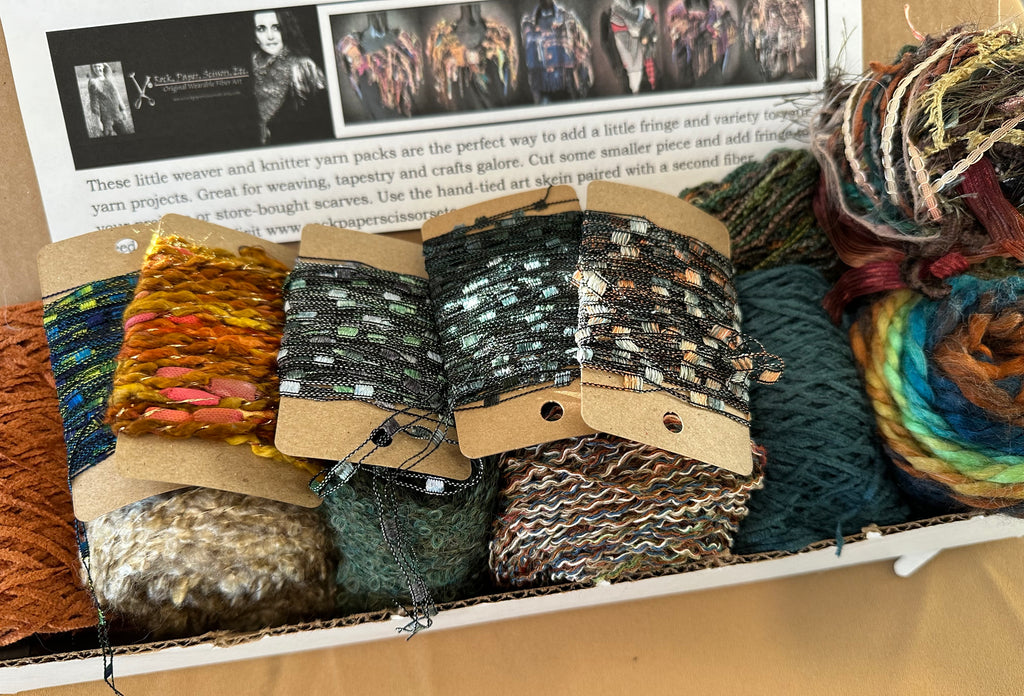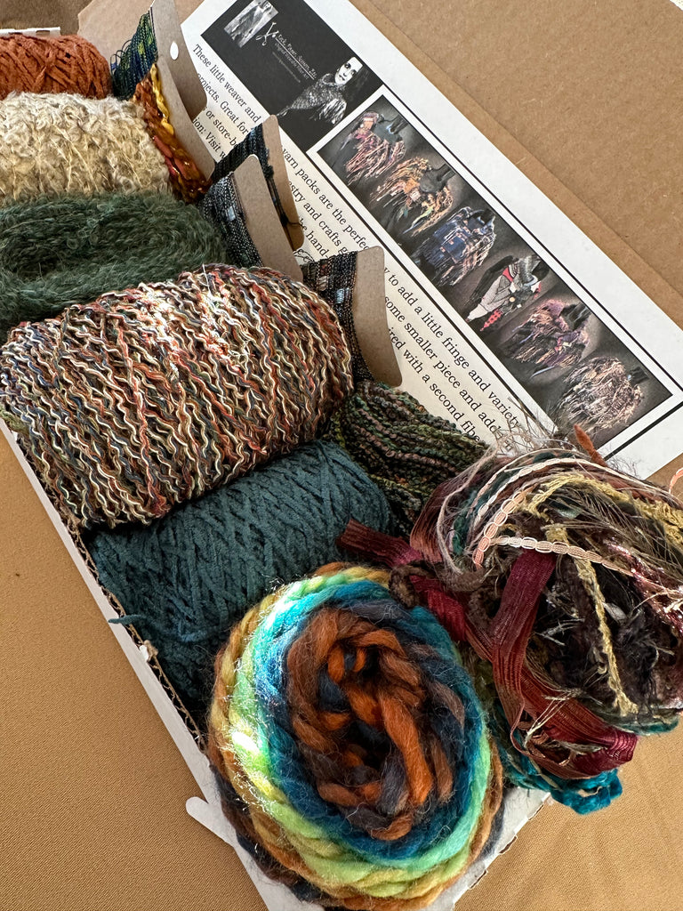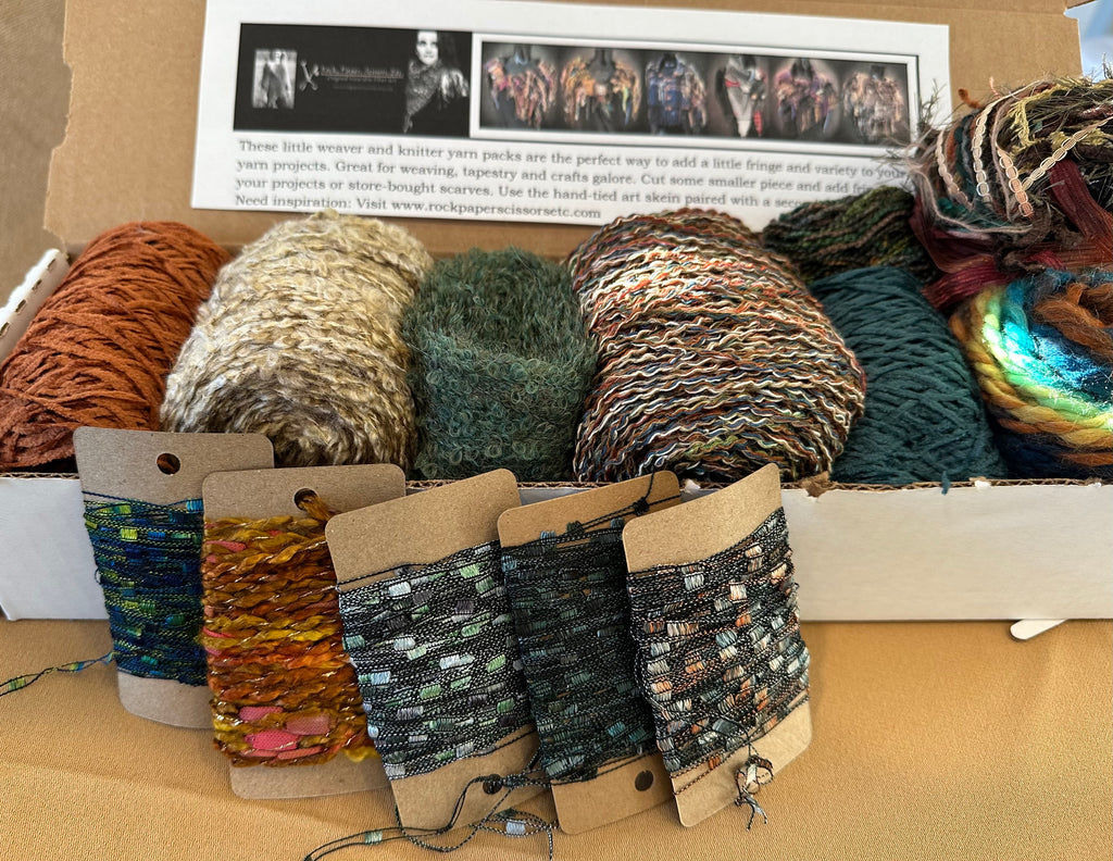 These mini yarn boxes are the perfect assortment of novelty fibers for knitters, weavers, yarn crafts and tapestry weavers. These yarn bundle gift boxes include a variety of fibers, ribbons and yarns, - all perfectly packaged for gift giving or simple storage. Includes a fun specialty yarn fringe grouping as well that is great to add fringe to your knit, cowls, drop knit scarves and more. *These are packed skeins - several over 80 yards each. Approximately 800 yards in this box! Includes hand spun merino. Includes a small mini ball skein of my hand tied yarn, fringe left untrimmed.