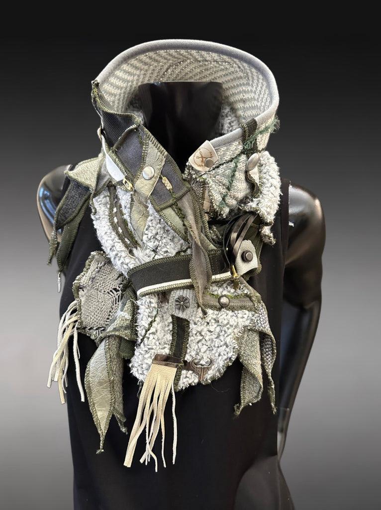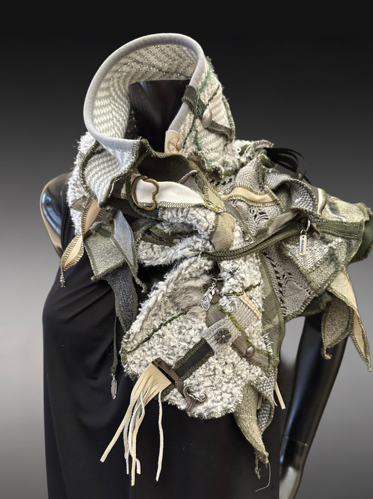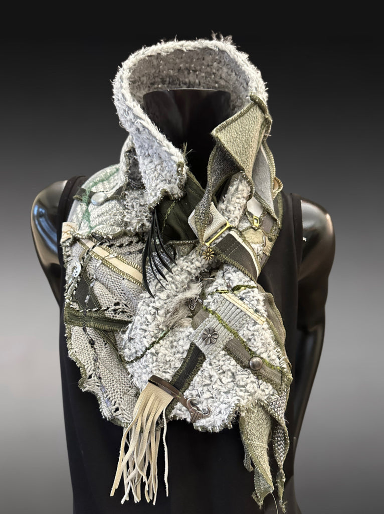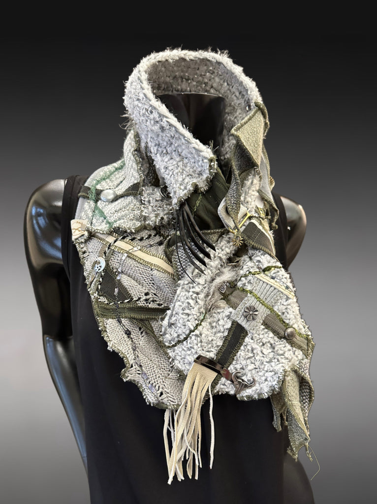 Pull-through structural statement scarf - upcycled eco-friendly avant garde fashion fabric scarf with embellishments - artisan fashion scarf. The variety of textures and detailing makes this artsy and classy. Includes two gathering loops strategically located for versatile styling as a cowl or scarf, with options based on which side you put the loop ends on (start with it over left versus right shoulder).