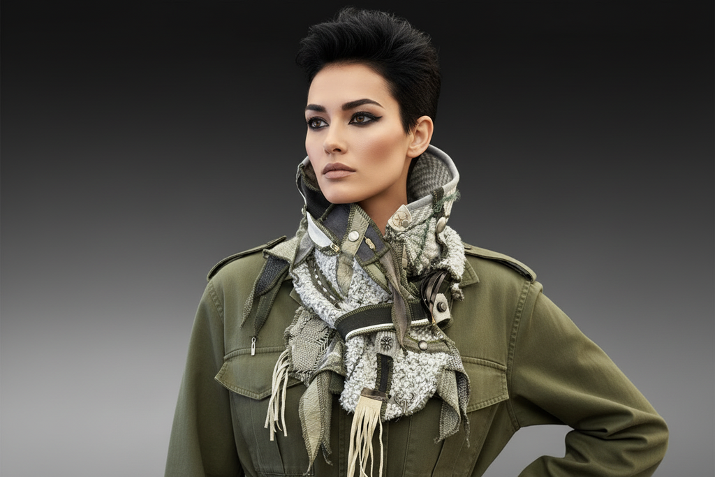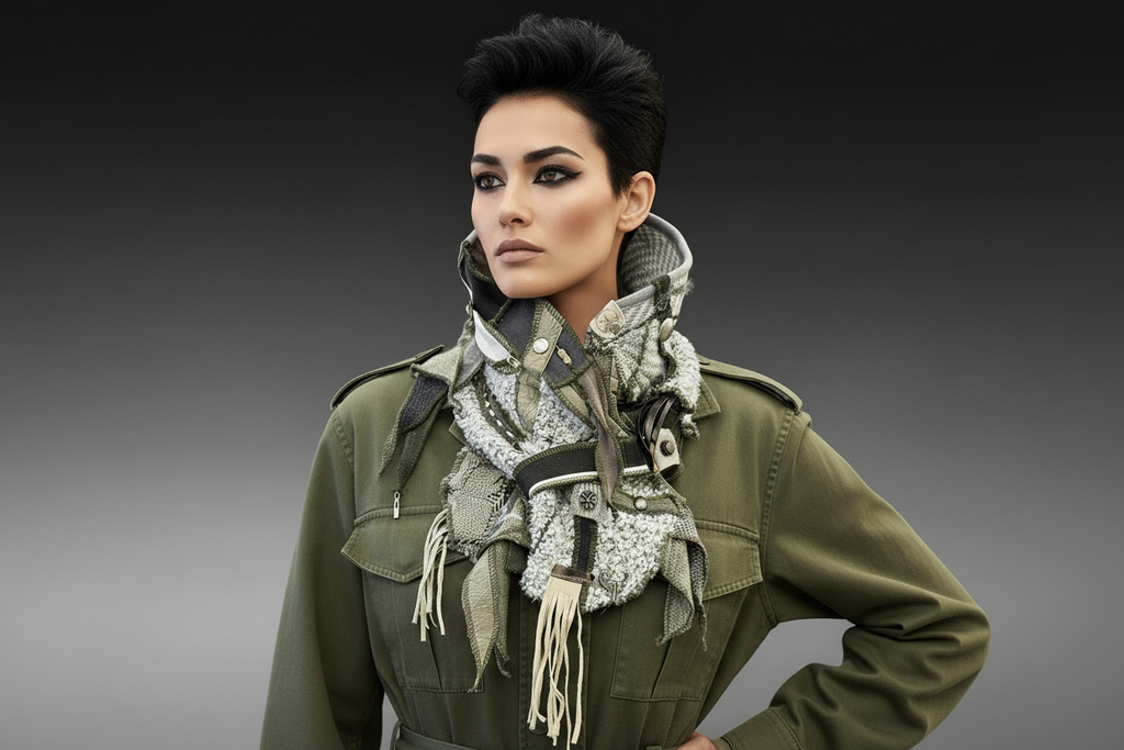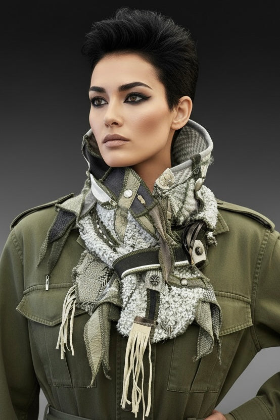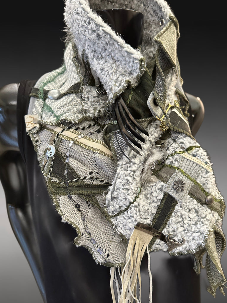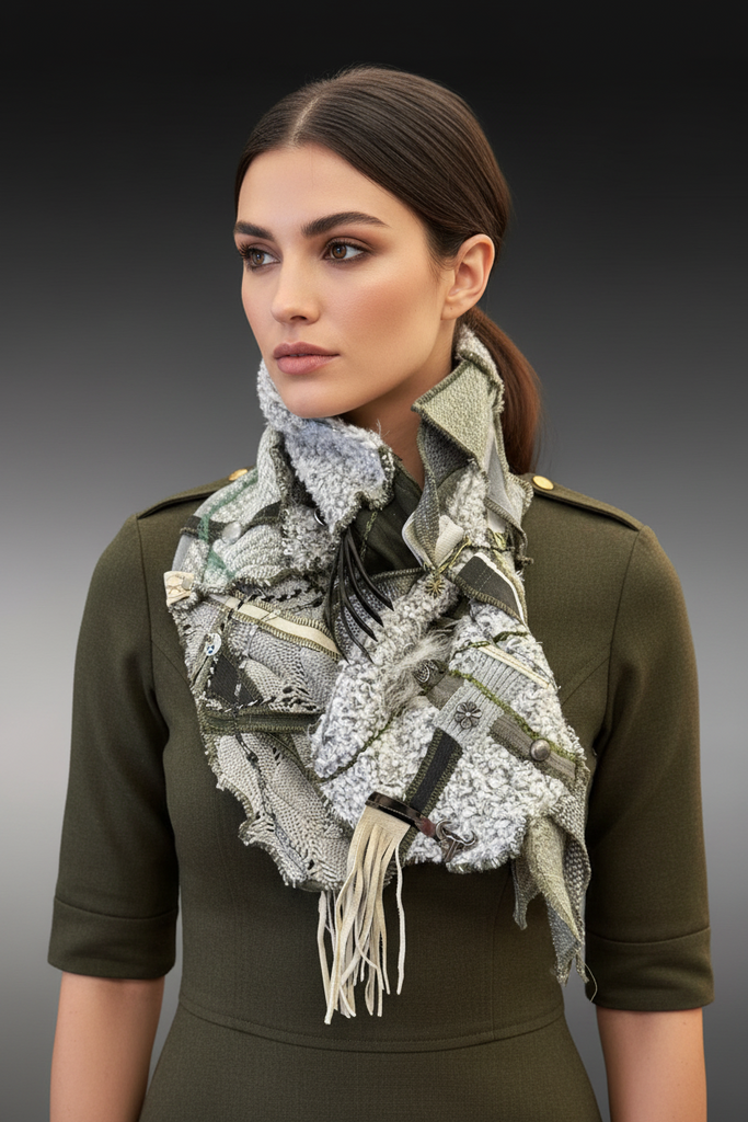 Pull-through structural statement scarf - upcycled eco-friendly avant garde fashion fabric scarf with embellishments - artisan fashion scarf. The variety of textures and detailing makes this artsy and classy. Includes two gathering loops strategically located for versatile styling as a cowl or scarf, with options based on which side you put the loop ends on (start with it over left versus right shoulder).