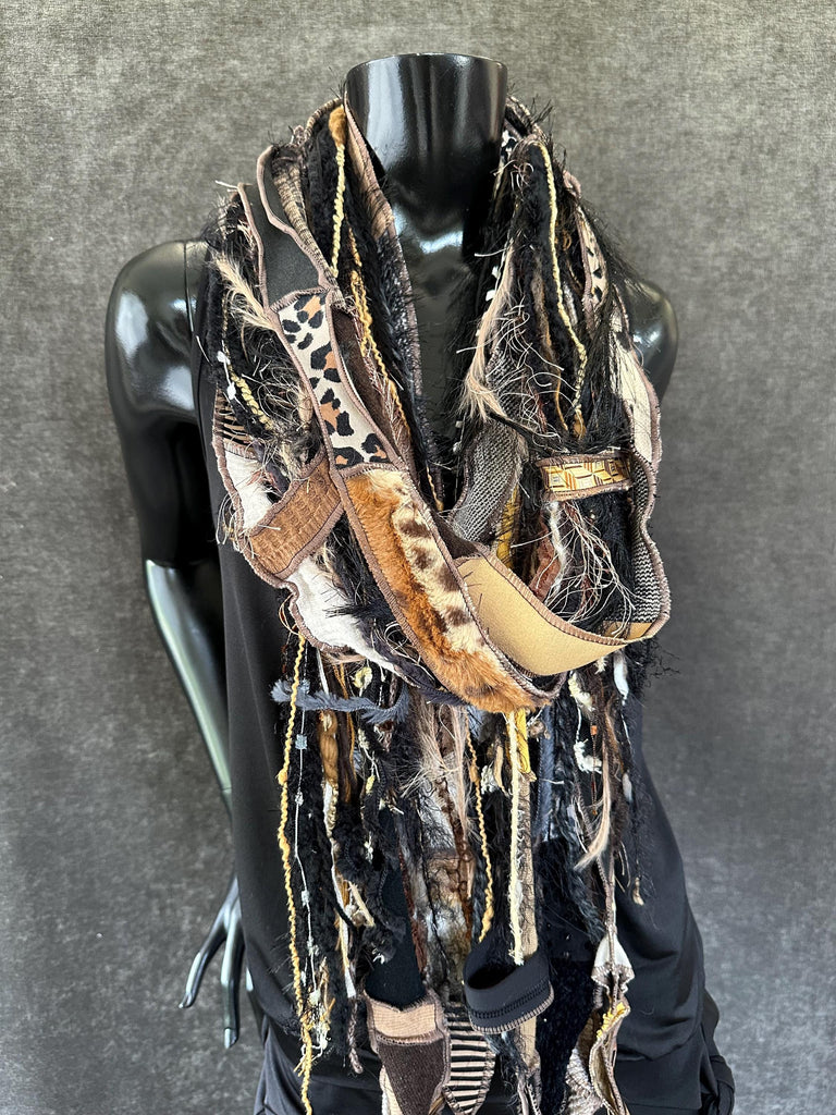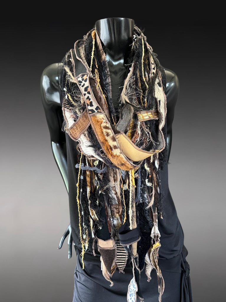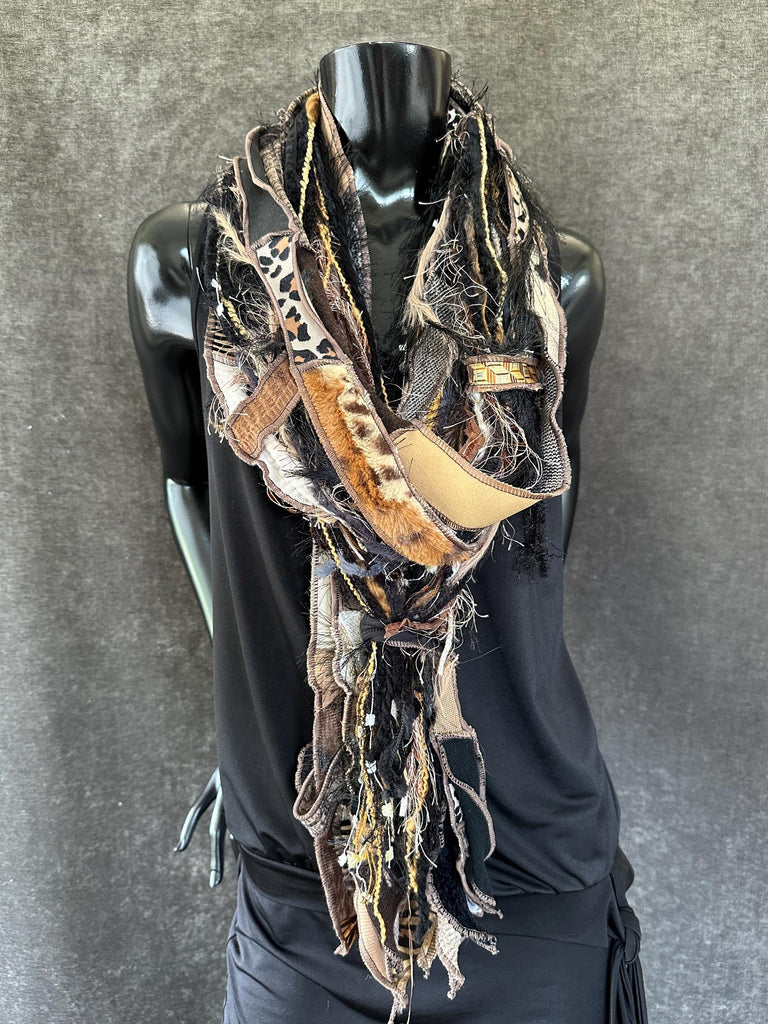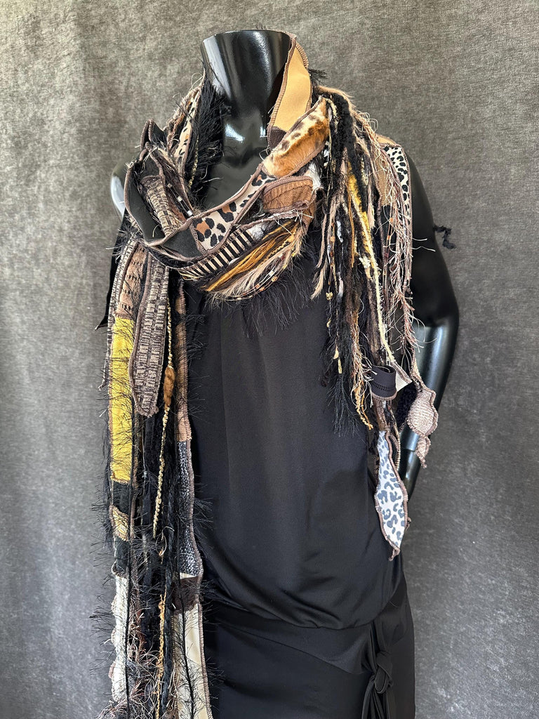 Unique eco-friendly bohemian style long artwear scarf in neutrals of black, cream, browns, tan with patterns in fabric. Artsy fiber fringe scarf, tribal scarf, boho accessory, tribal fashion. Perfect easy women gifts! Animal prints make this unique and stylish.