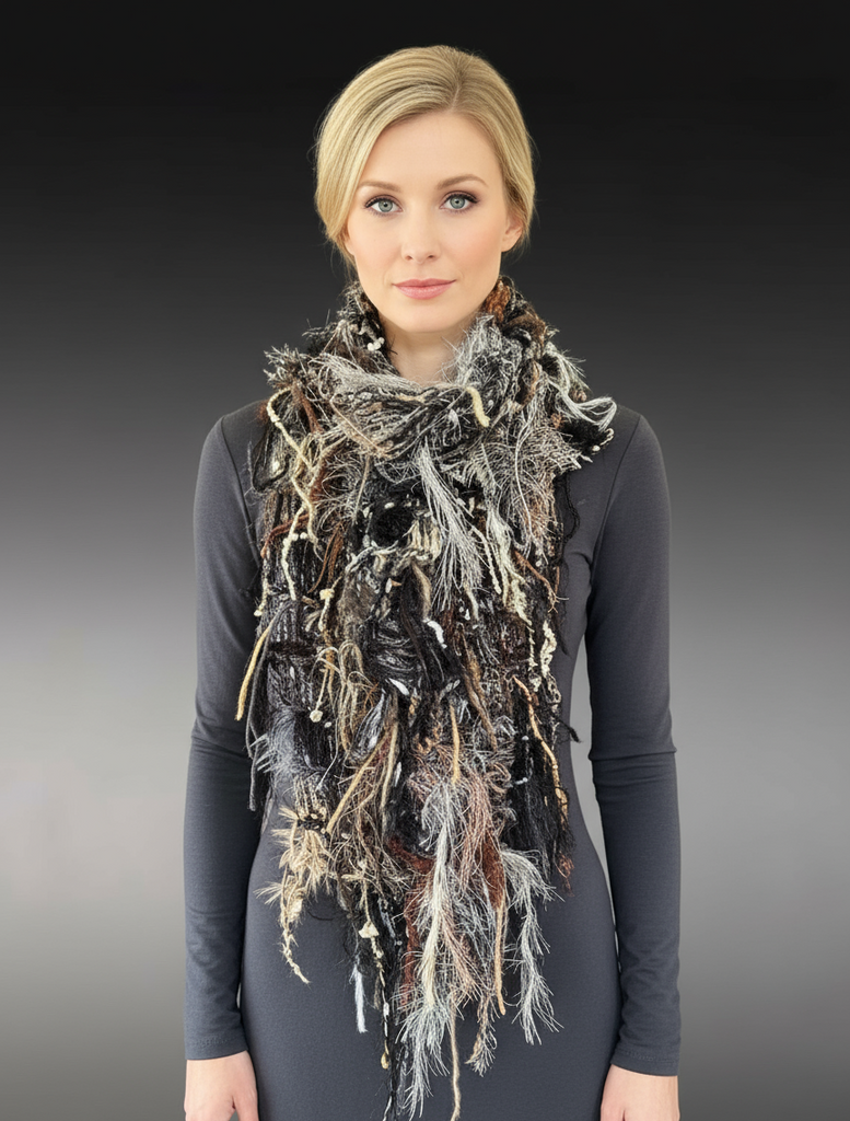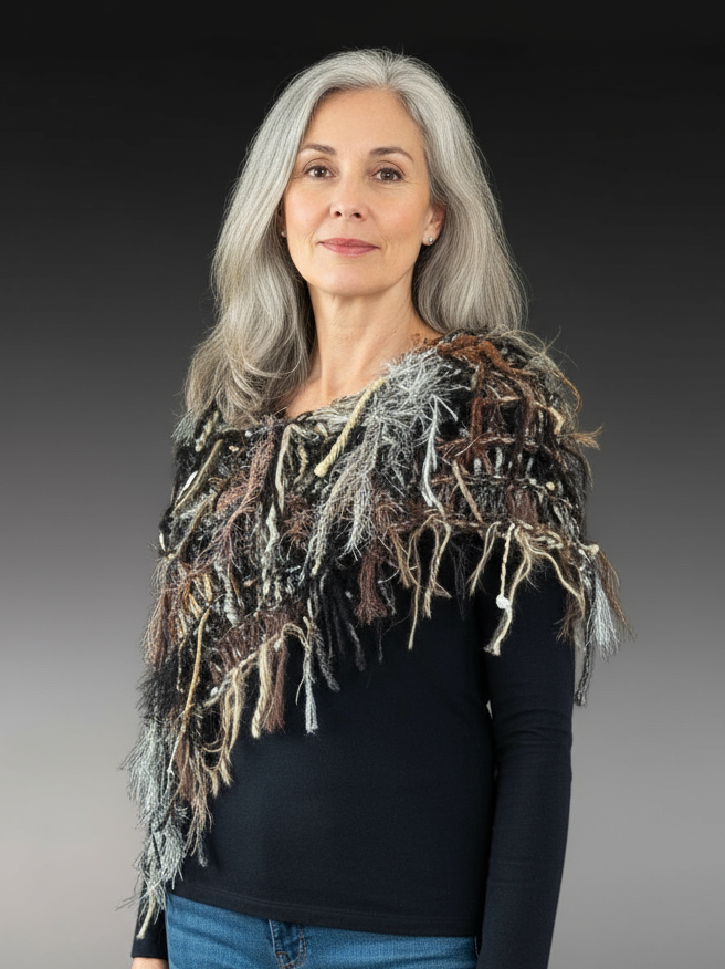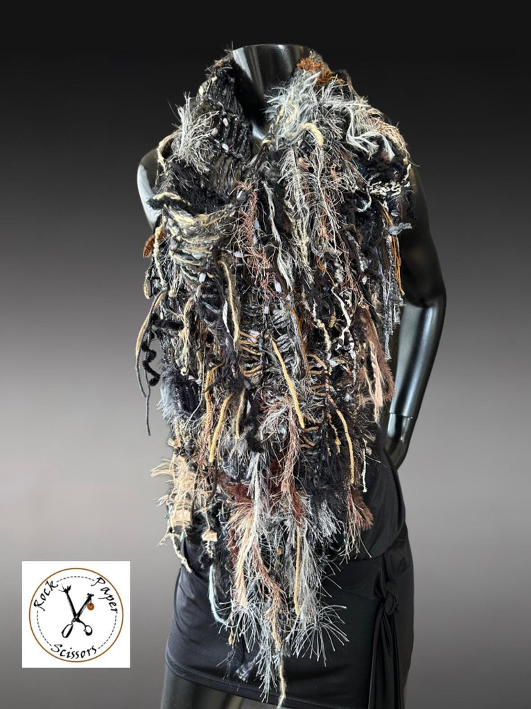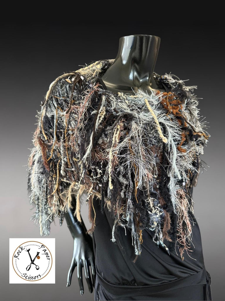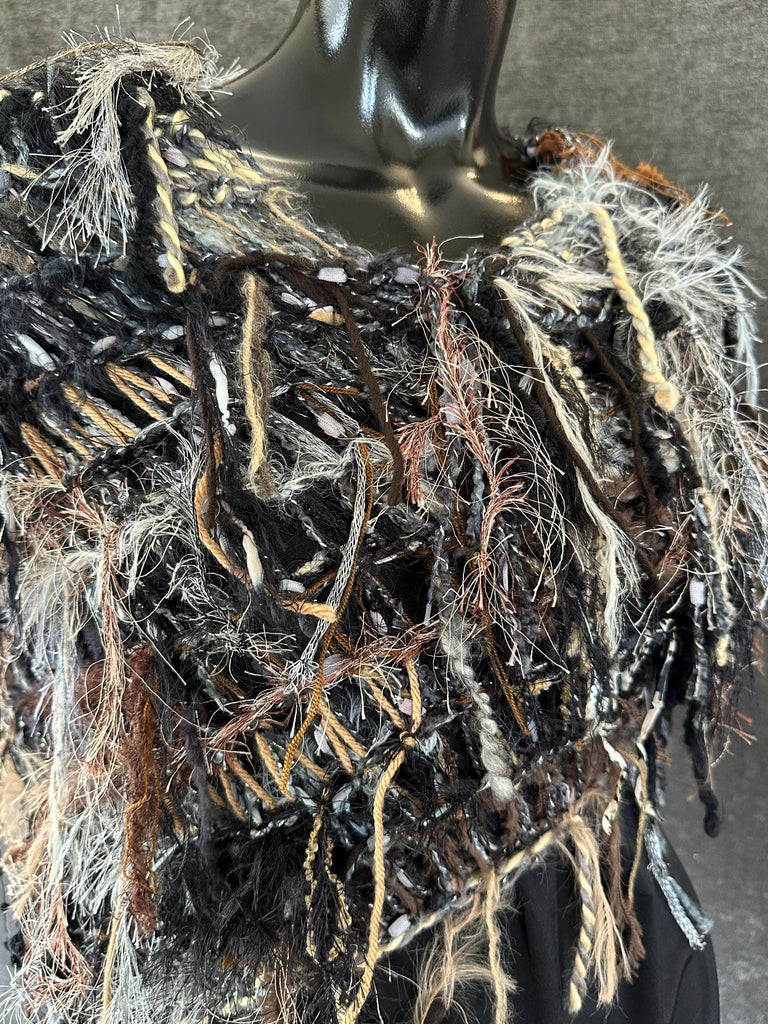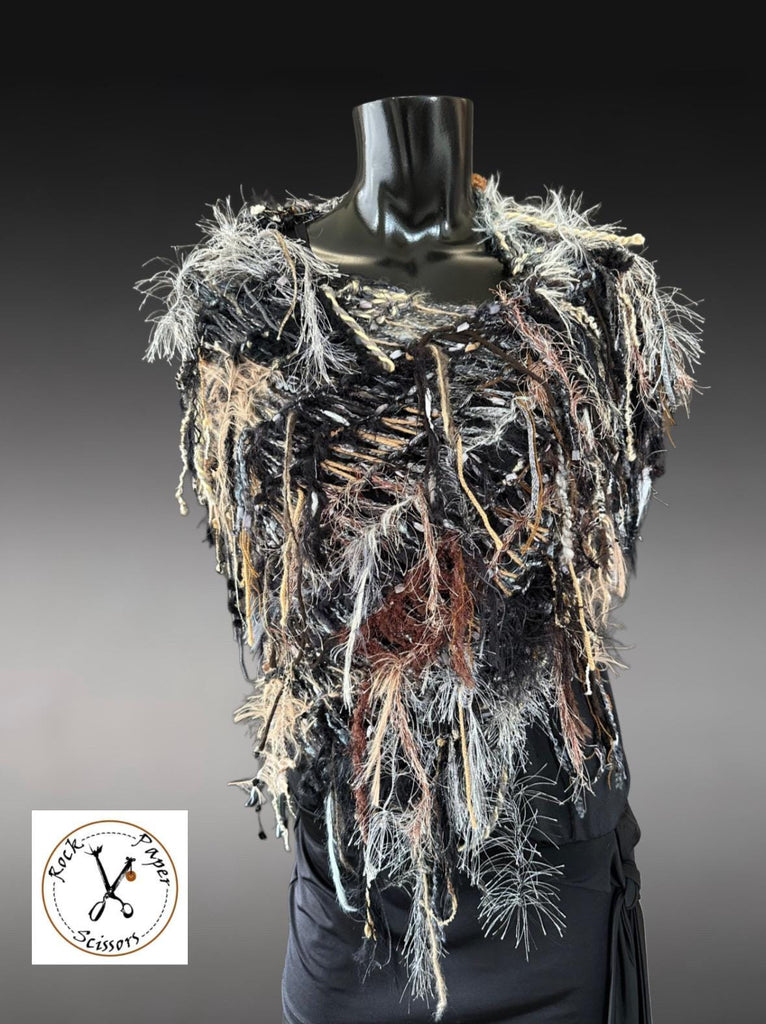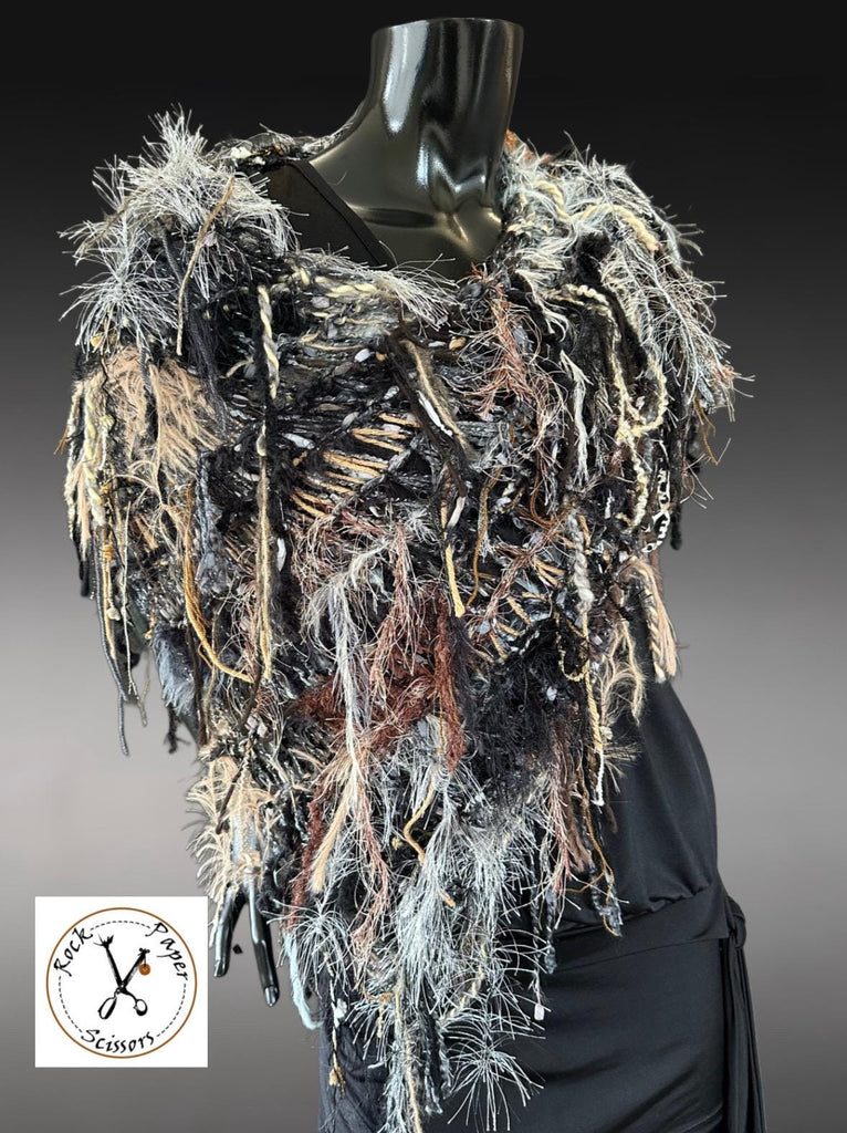 This piece is a fun, artistic, shaggy way to show your ‘dumpster diva’ and "Stevie Nicks" style! It’s a collection of over 20 different materials, hand tied and knit together in a drop knit shawl or poncho style, blended with a fluffy black two-ply fur like acrylic. The fringe is integral to the piece, as it’s composed of my custom hand-tied diva skein yarn gathered from all over the world - so you have a unique piece!