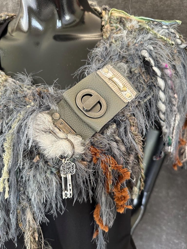 Luxury and premium handmade and artistic yarns and functional clasp on leather with a touch of bunny fur. This is a unique petite tapered cowl or shoulder wrap.