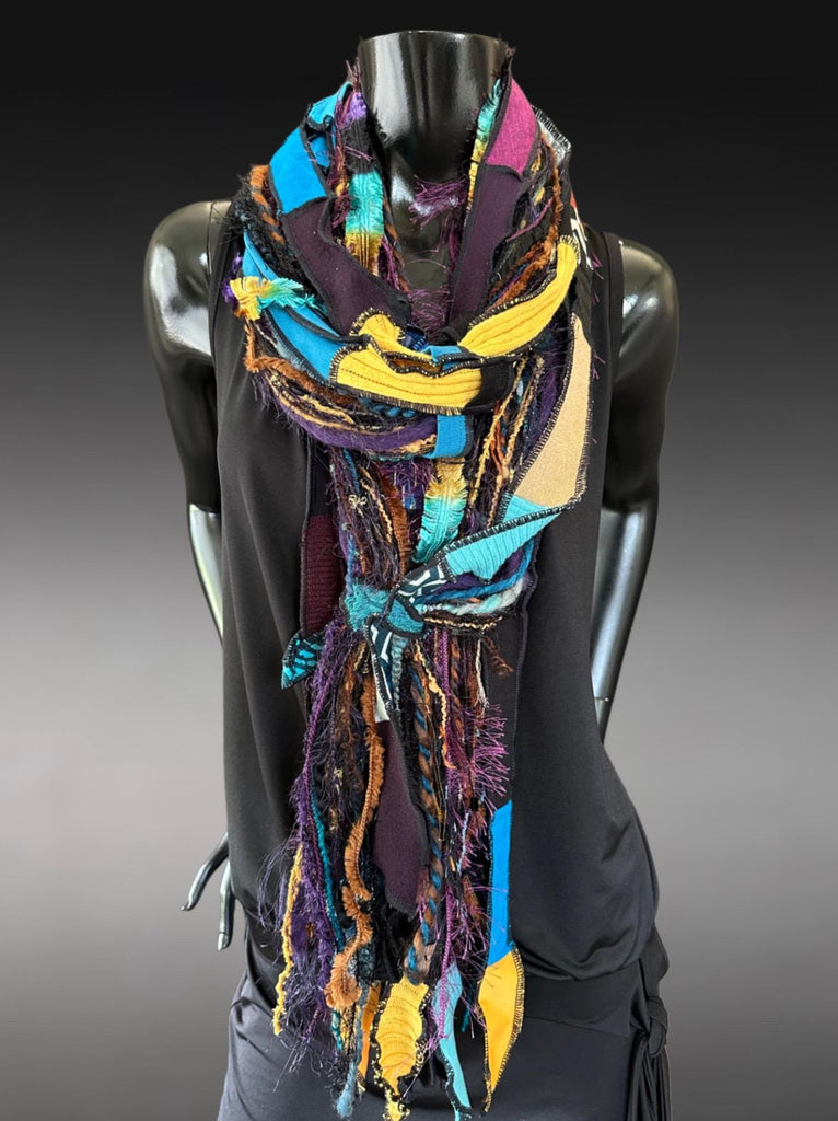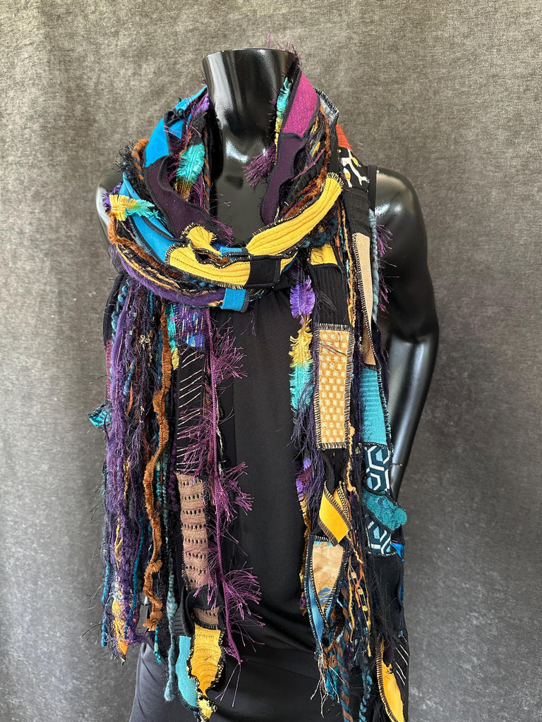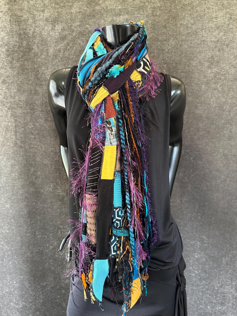 Pop culture handmade long artwear scarf in lively, art-inspired avant garde and pop-culture style. The cool jewel colorblend of purples teals blues and black withpops of vibrant mustard and yellow shades. Artsy fiber fringe scarf, indie scarf, street style accessory, boho hippie fashion. Perfect easy women gifts! Perfect Johnny Depp male and unisex style as well.