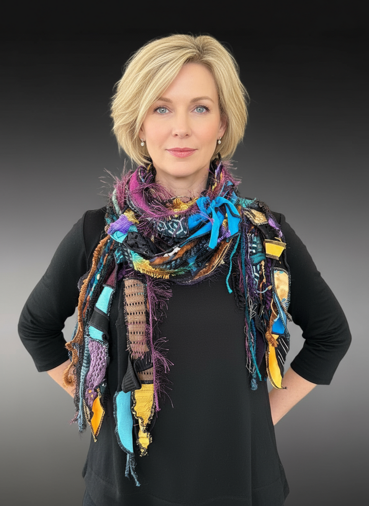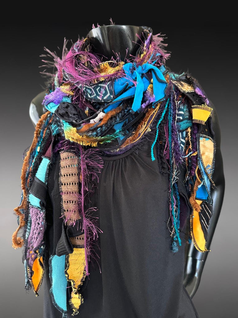 Multicolor fabric strips with sewn edges and ties plus glorious art yarn fringe. Best seller at in-person shows (160+ sold).