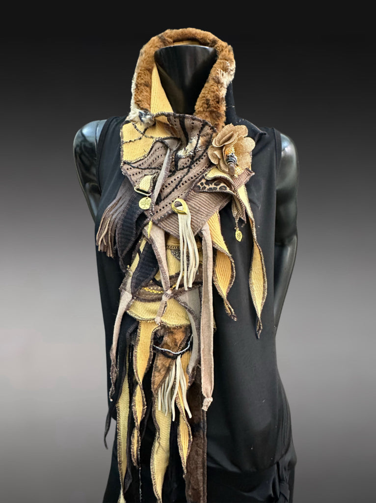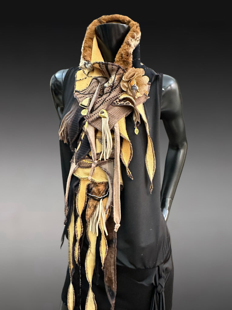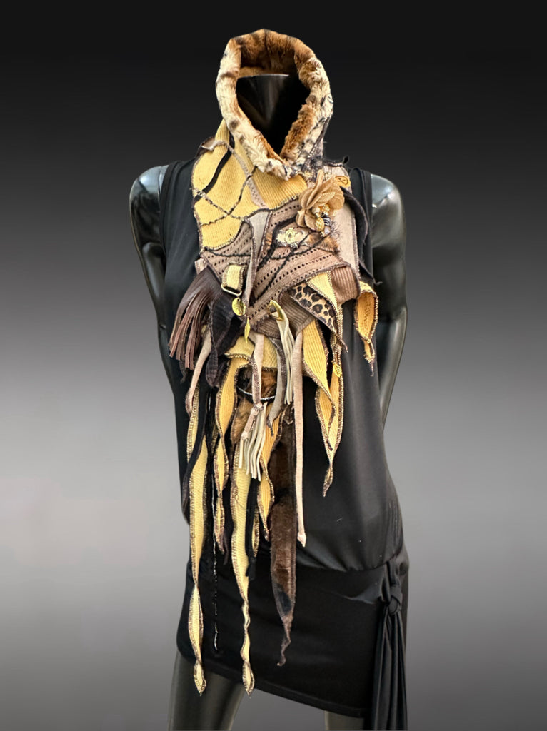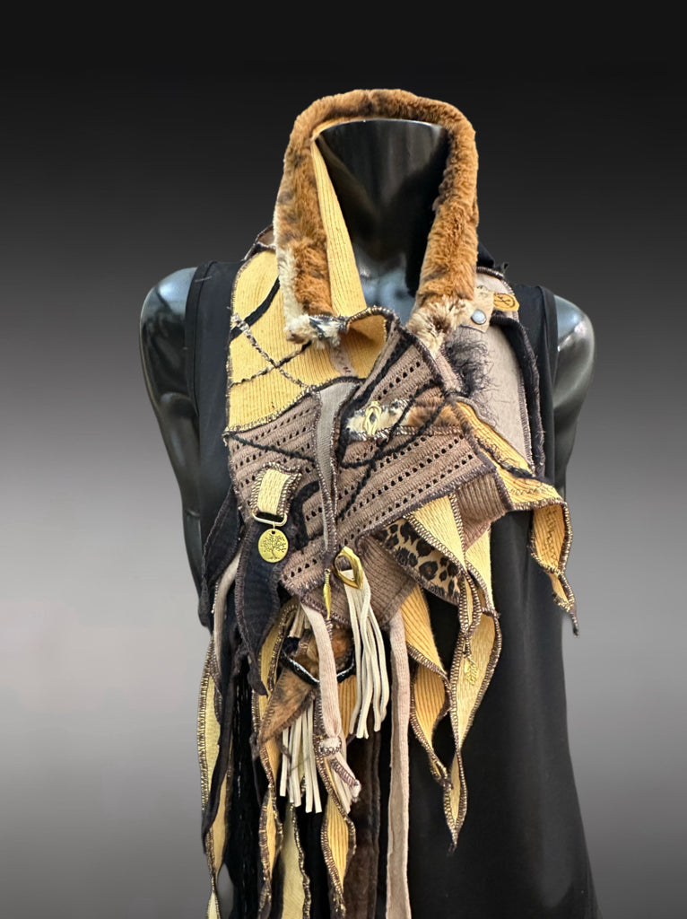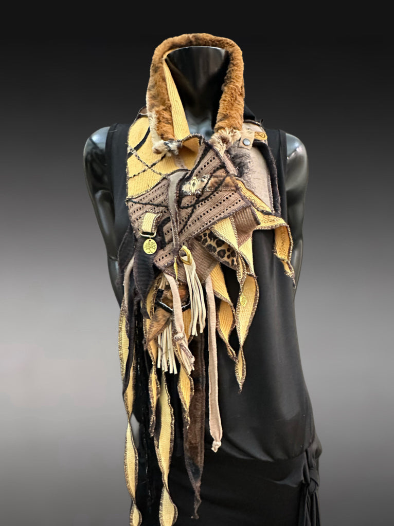 This dramatic, pull/through pocket style wrap scarf is meticulously crafted from upcycled mustard yellow colorblends, distressed linens, upcycled fabric remnants, and salvaged leather fringe in an earthy palette of mustard, gold, brown, bone, and abstract cheetah print. Every strip has been carefully selected, sewn, embellished, and layered to create a rich, textured story of time and survival.