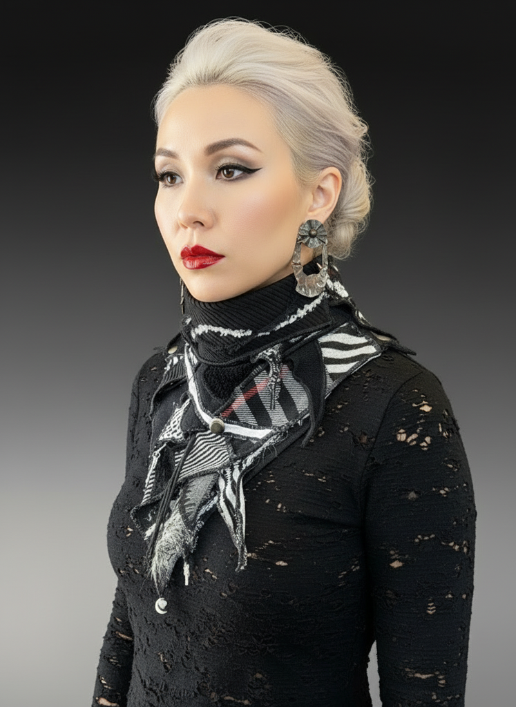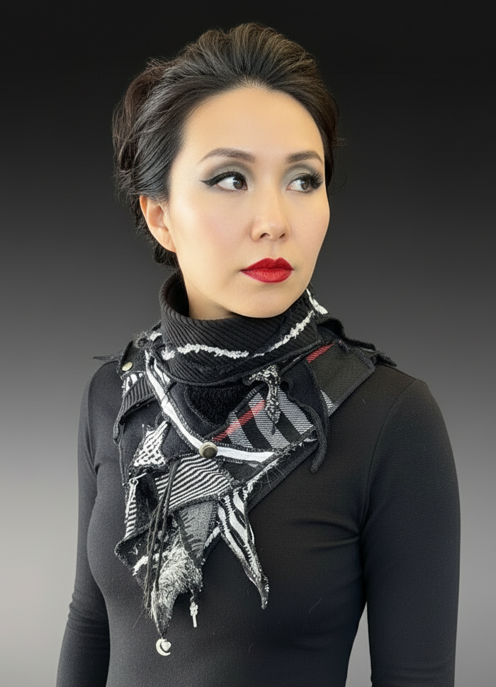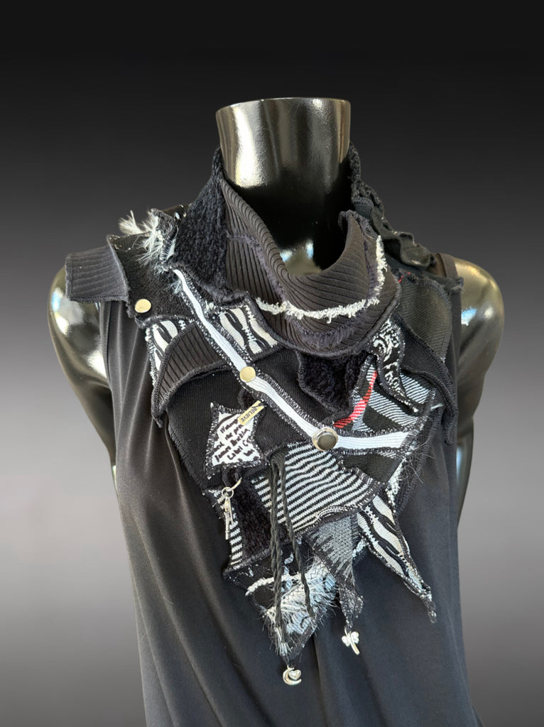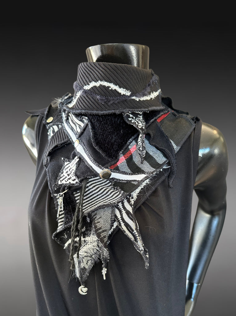 Statement refashion Street style style cowl in black white and hints of red, plus stripes and abstract newsprint patterns, embellishments, and more. Boho or artisan couture fashion style button up turtle neck style neck warmer. Funky and functional artistic fashion accessory. Fabrics are a blend of cotton blend, knits, nylon and polyester soft fabrics. One of a kind. Collar is flexible and draping.