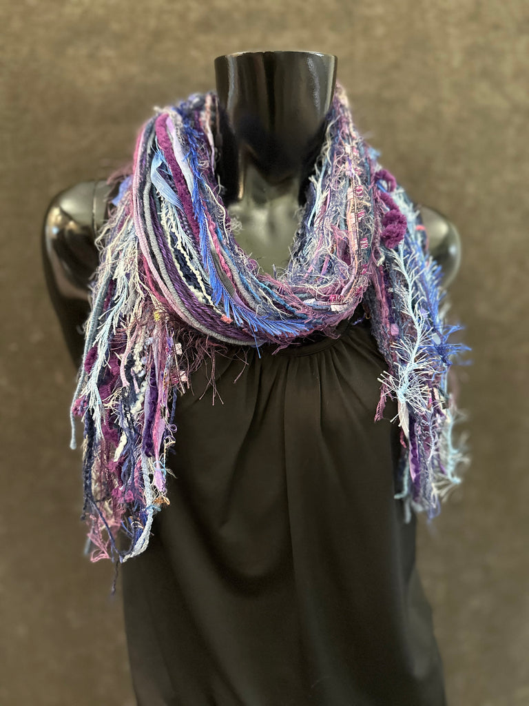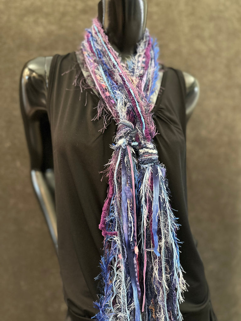 I have managed to acquire quite an array of materials over the years from all over the world - and all are perfect for multitextural fringies! I’ve officially sold over 4,500 fringies, and I love making them! This is a great simple, no-hassle gift or perfect to add to your own wardrobe! Fringies are fun no matter how you wear them - wrapped, tied, locked in place with an artistic pin and more!This Fringie is wonderfully soft at approximately 4’-5” in length and packed with fibers! If you prefer scarves to stay away from your neck or hang longer, I do recommend the full length version of Fringies. This mannequin has a rather small neck for comparison.