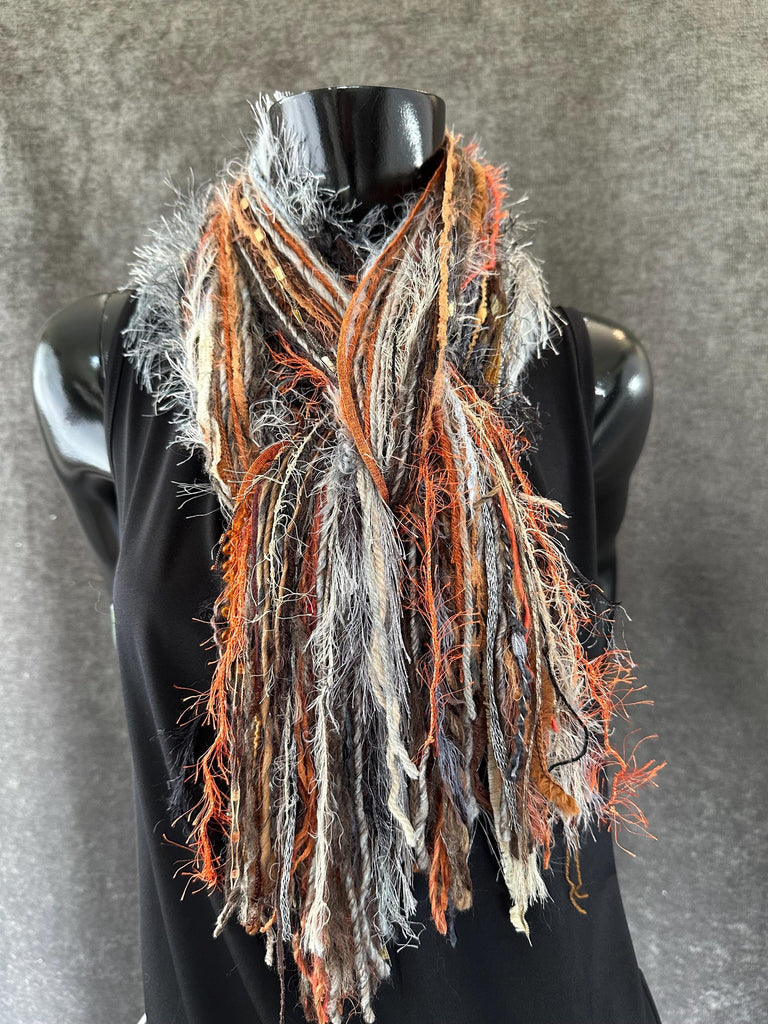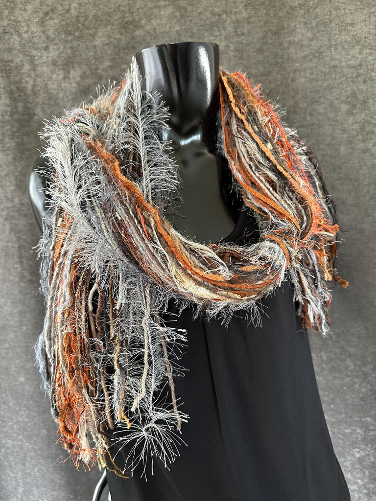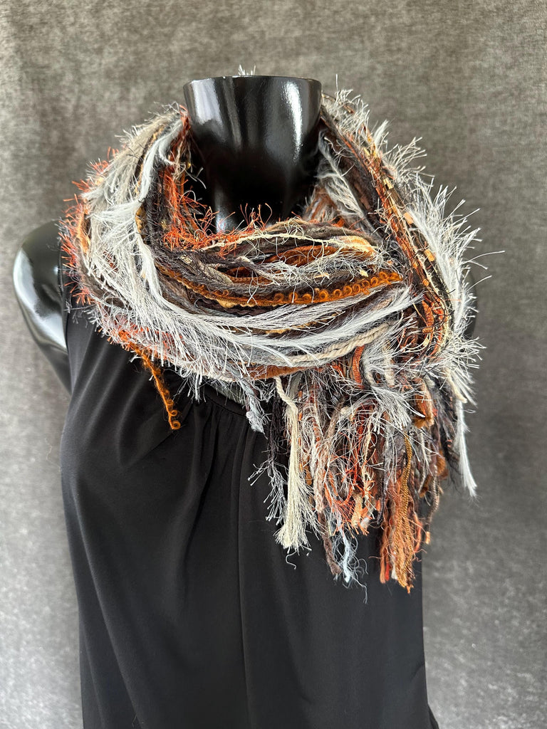 Long bohemian style scarf with art yarns and artful textures and fibers in a multicolor subtle blend of cream, gray muted rust, medium brown. taupe and hints of black - perfect for all year styling and great with winter whites.
