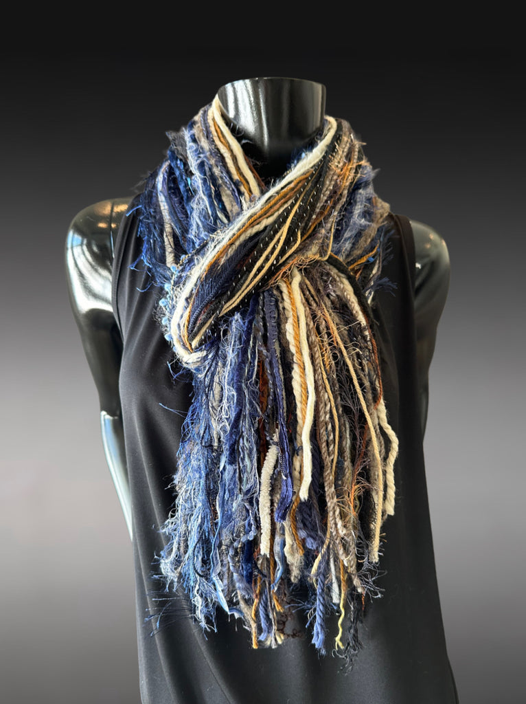 A unique artwear boho or tribal style fringie scarf in electric and jean blues, navy, rusty beige and various cream hues plus black and medium browns. One of a kind scarves keep your wardrobe original! Perfect with jeans!