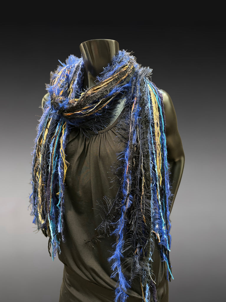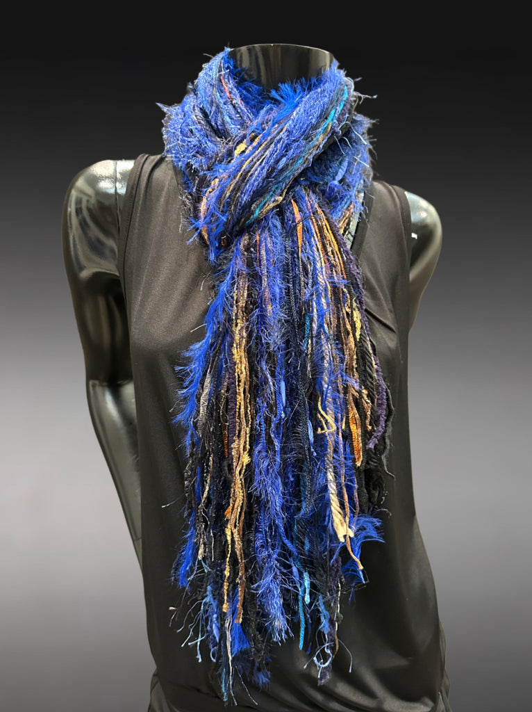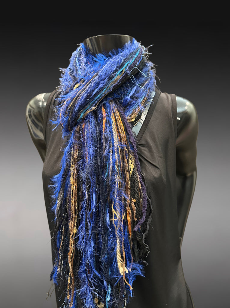 Elevate your style with this handmade boho fringe scarf, crafted from a bold blend of art yarns, textured fibers, and luxe fringe accents. This statement piece features rich tones of electric blue, deep black, and beige and brown accents with hints of rusty orange, creating a stunning, one-of-a-kind wearable art accessory.