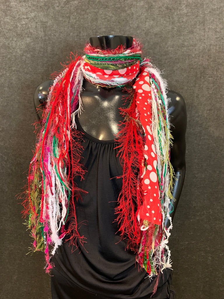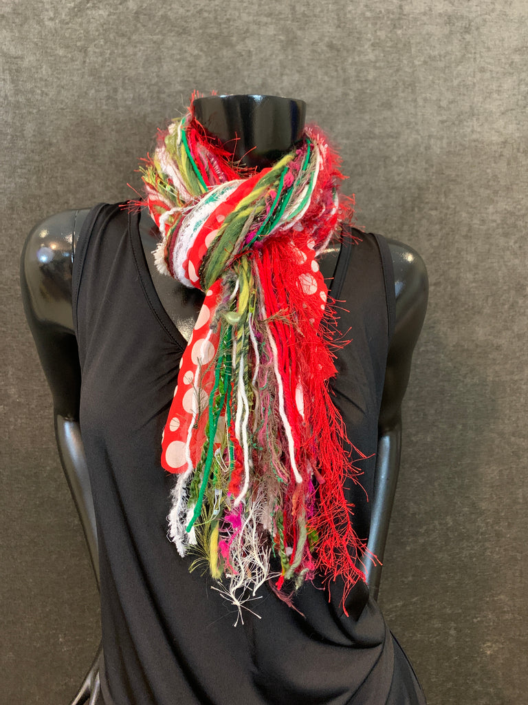 I have managed to acquire quite an array of materials over the years from all over the world - and all are perfect for multitextural fringies! I've officially sold over 3,700 fringies, and I love making them! This is a great simple, no-hassle gift or perfect to add to your own wardrobe! Fringies are fun no matter how you wear them - wrapped, tied, locked in place with an artistic pin and more! This fringie is approximately 4‘-4” long.