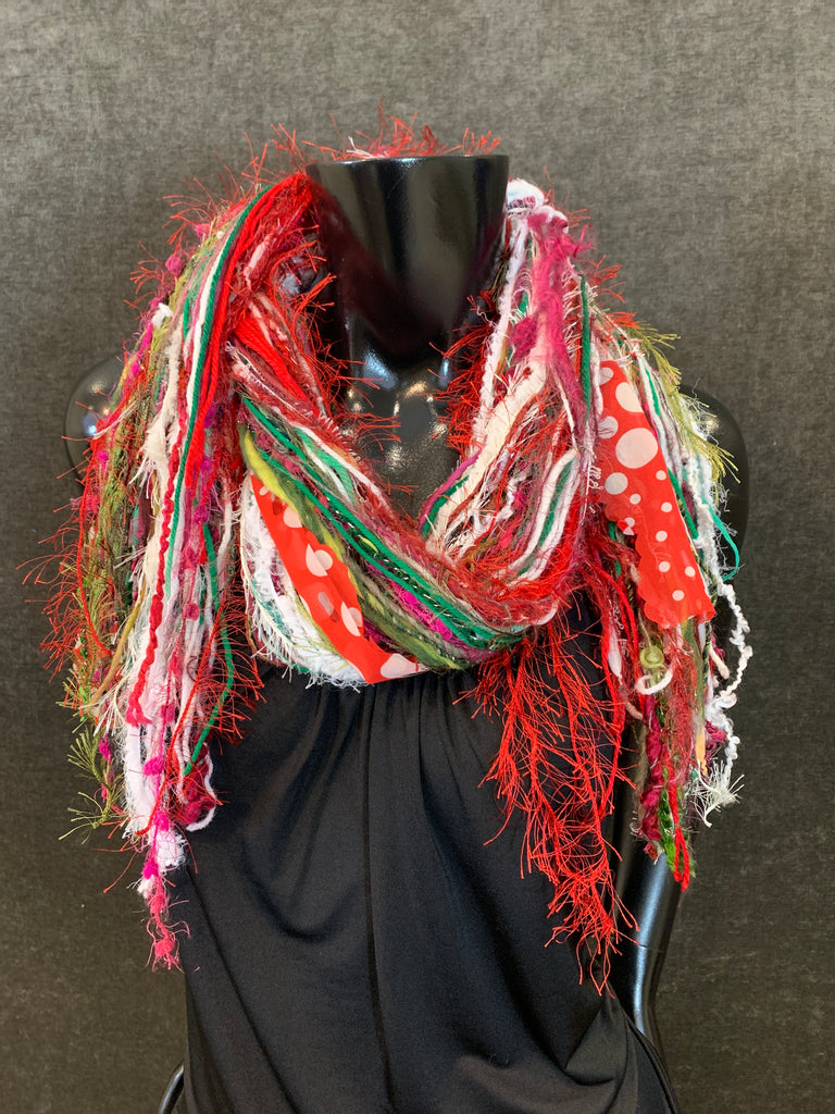 Fringies have a blend of tons of my favorite knitting textures and yarns all tied together into one pure fringe piece! Fringies include everything from hand-dyed freyed ribbon, satin, ladder ribbon, cotton, merino, nylon, eyelash, boucle and more! The fringe is the best part of a scarf after all, right?? The knots at the ends make it easy to wrap and unwrap by acting as little 'handles' to pull it loose and unwind.