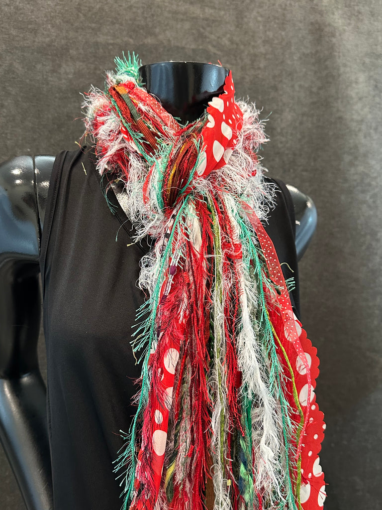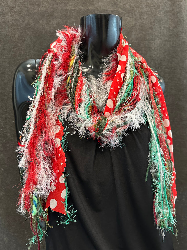 Perfect for the Holidays! A Christmas color 'grinch' scarf with a punch of bright red, lime and polka dots! This is the long length. Perfect with that ugly sweater, for gifts, teachers, secret Santa and at the office!