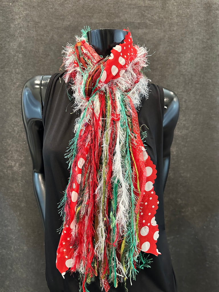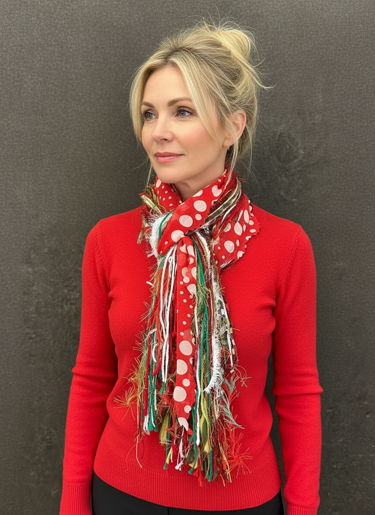 Christmas Scarf, Grinch Fringie, Christmas color red, green red and white with polka dots and lime green, fashion scarf for Christmas, dots