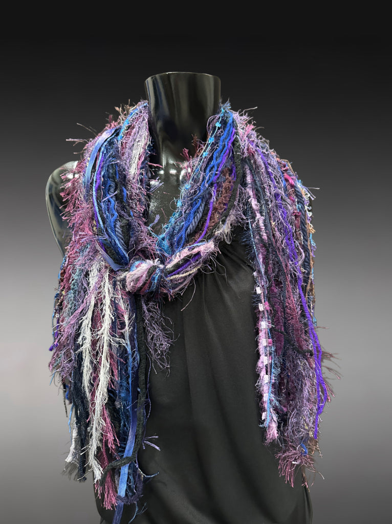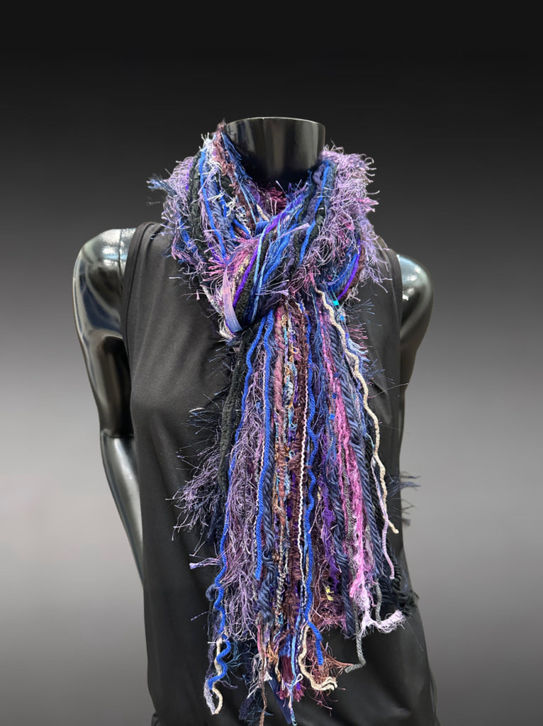 Handmade Boho Fringe Scarf, Blue, Purple & Textured Art Yarn Statement Accessory, avant garde style
