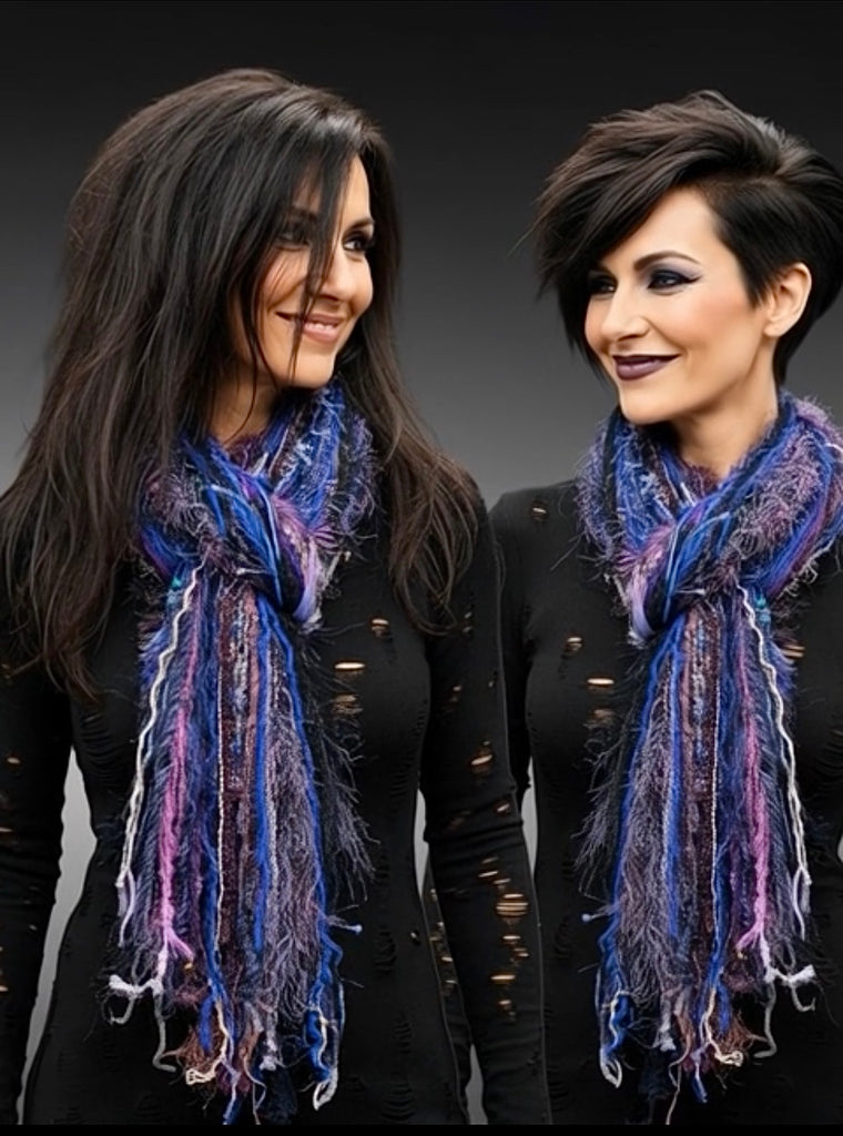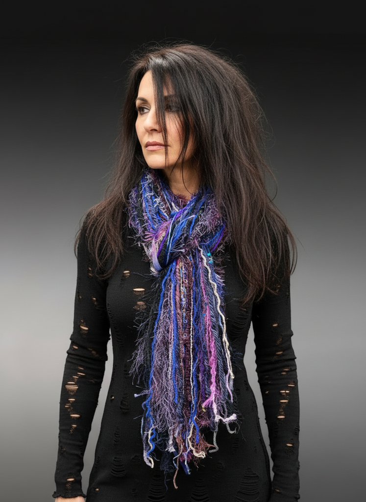 The scarf’s long drape and dimensional fibers make it an effortless statement piece—ideal for everyday wear, festivals, fall and winter outfits, or unique gift giving. Each scarf is individually crafted, ensuring no two are the same. Includes premium and luxury art yarns and ribbons.