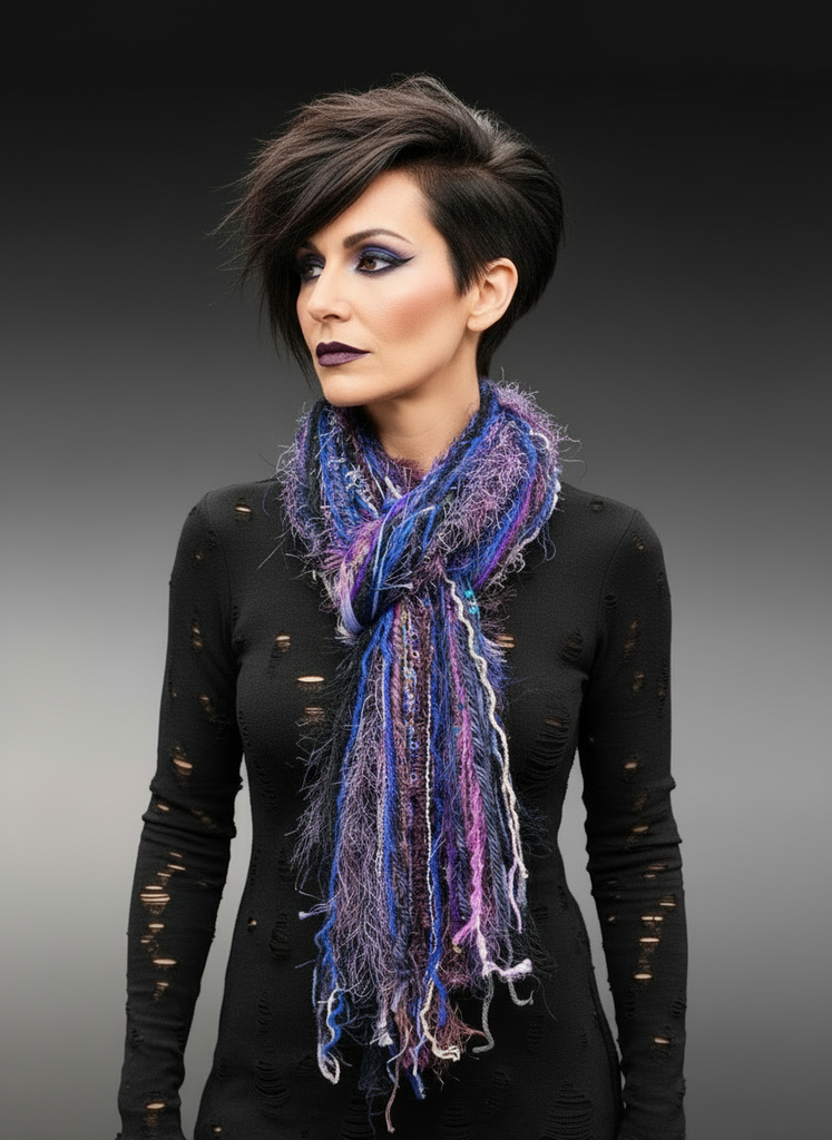 Add bold, artistic style to any outfit with this handmade boho fringe scarf, crafted from a rich blend of textured novelty fibers in blue, purple, lilac, and soft neutral gray tones. This lightweight yet cozy scarf features multi-layered fringe, mixed art yarn textures, and hand-tied detailing, creating a one-of-a-kind piece perfect for lovers of boho fashion, indie style, and creative accessories.
