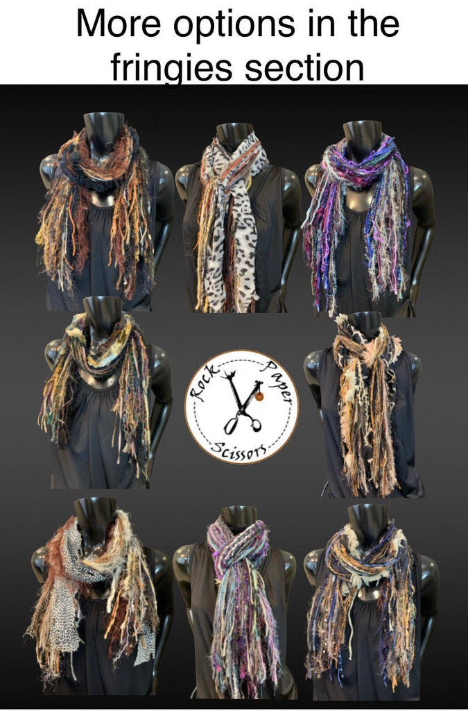 A gorgeous fun casual colorblend with great textures! Snuggly soft! Perfect for all season wearing, and great for fall and winter warmth! These are not knit or crocheted or sewn. Approximately 25+ different artistic and novelty fibers hand-tied into a wonderful all-fringe scarf.