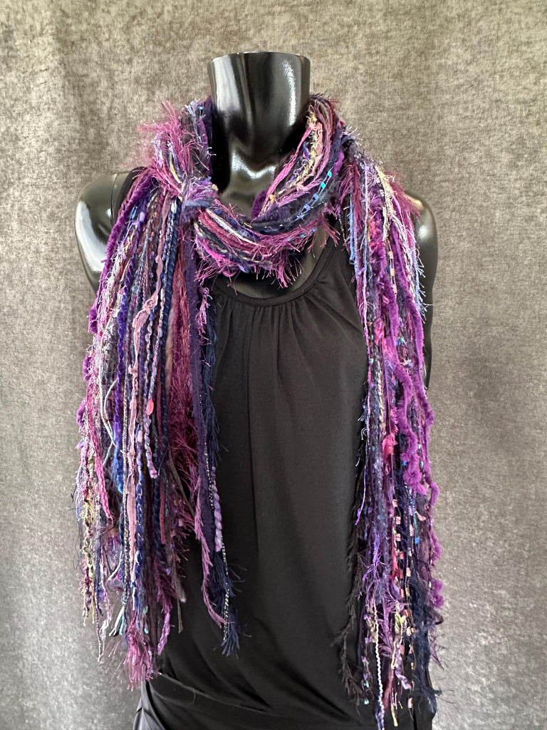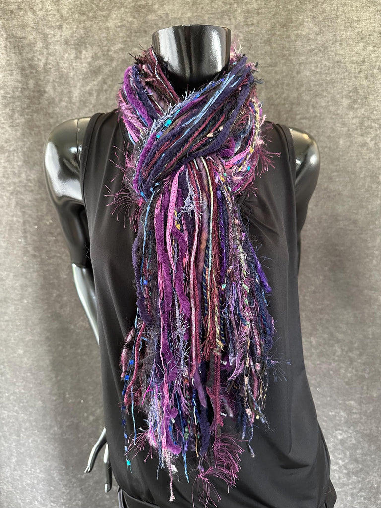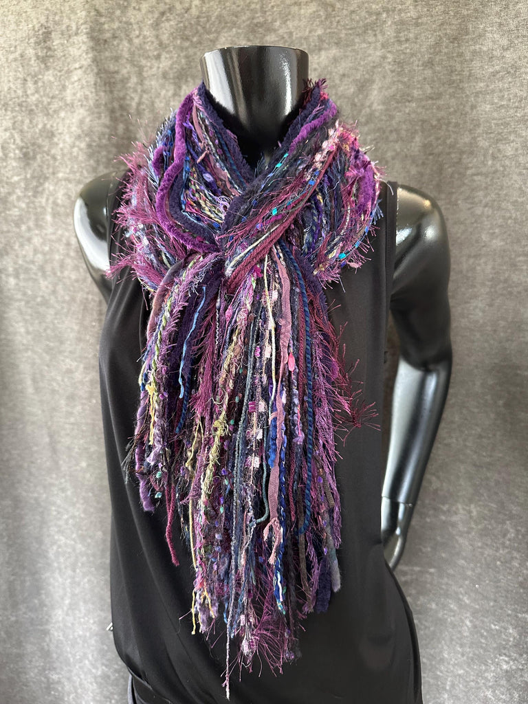 Handmade Boho Indie style art scarf in Purple blue jewel tone