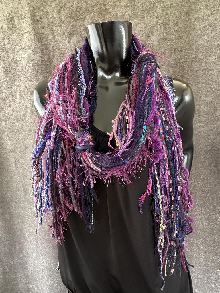 A Funky Fringie handmade bohemian scarf for the lady who loves jewel tones of deep rich purple, slight hints of aqua, black and blues.