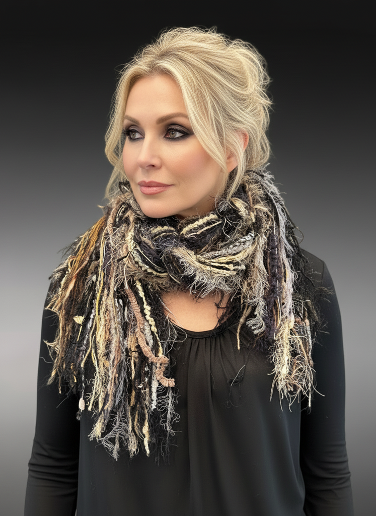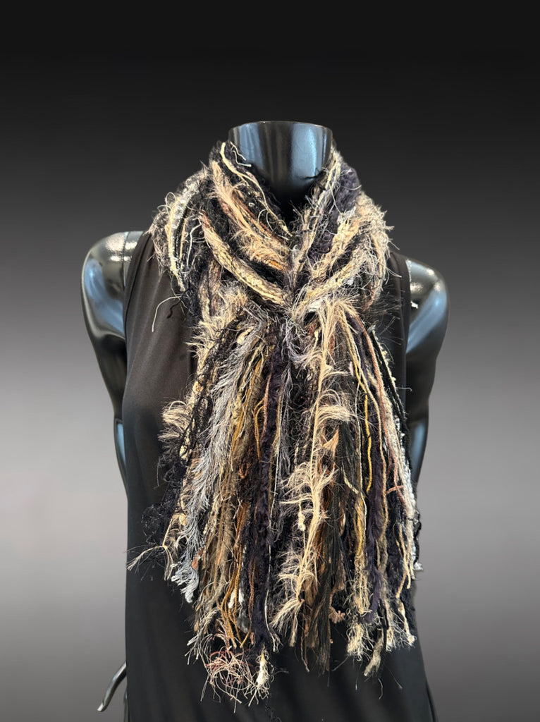 Cowgirl style black tan neutral color fringe scarf with art yarns, Luxury avant garde fringe scarf