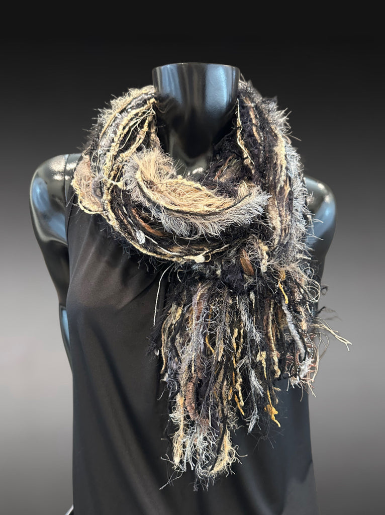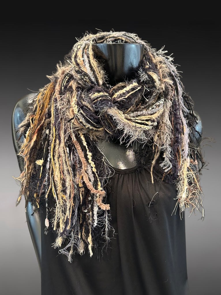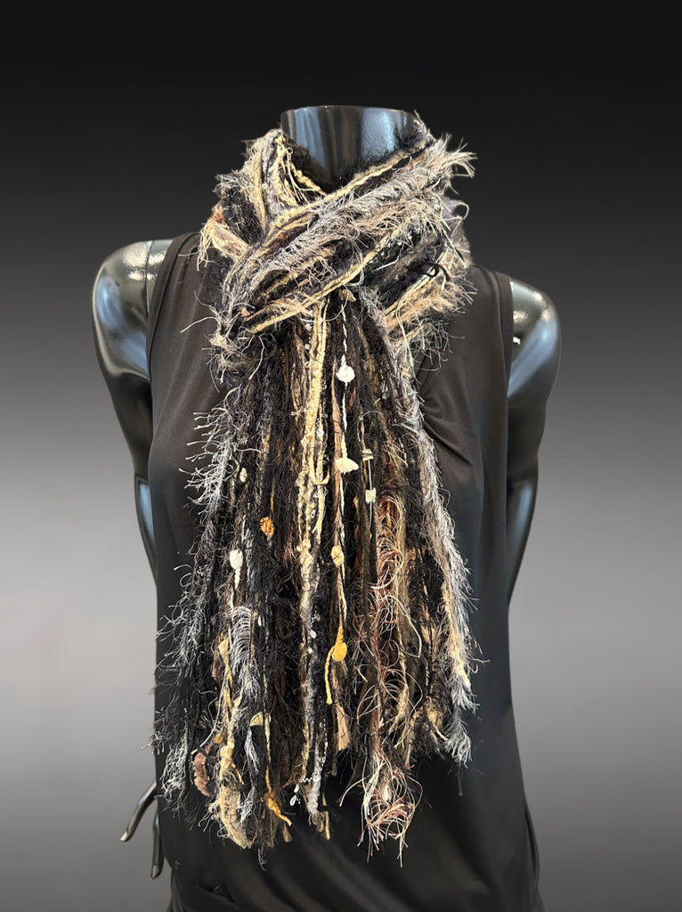 A unique artwear boho style long fringie scarf in black and medium tand, hInts of mustard, cream, brown shades and various coordinating shades. One of a kind scarves keep your wardrobe original!