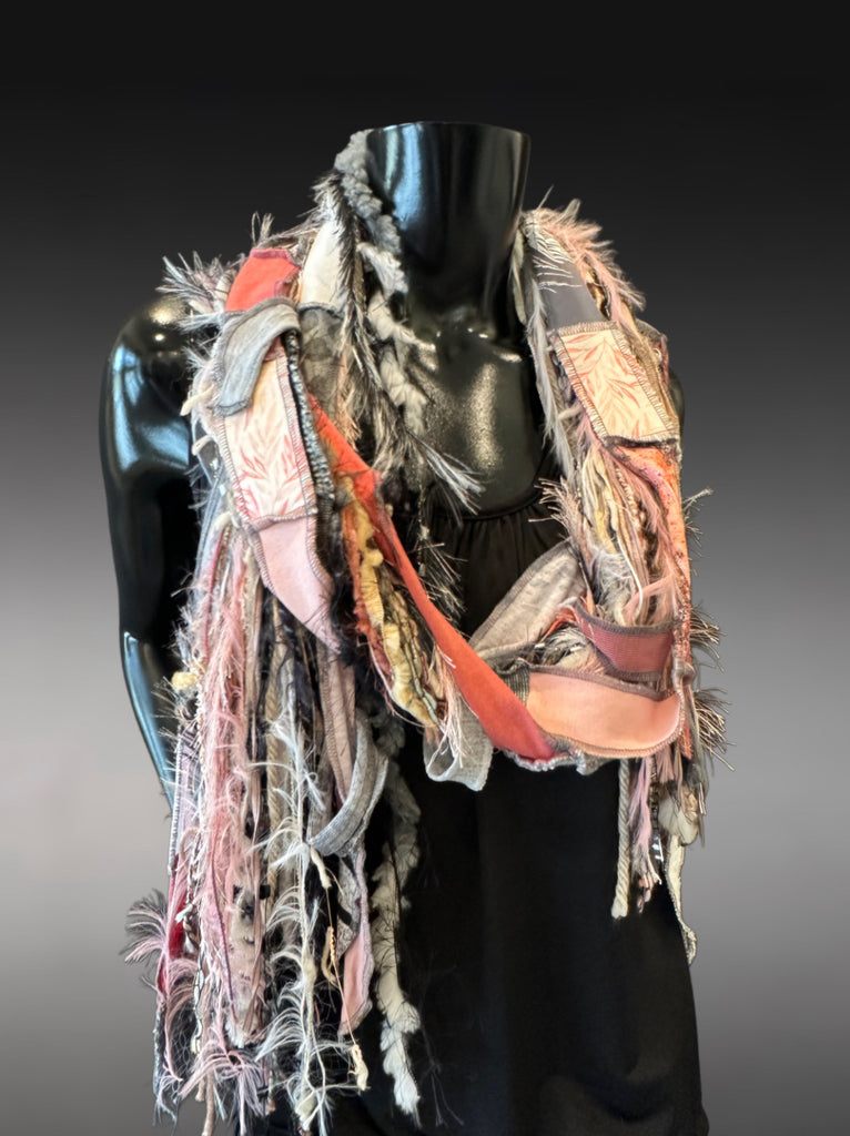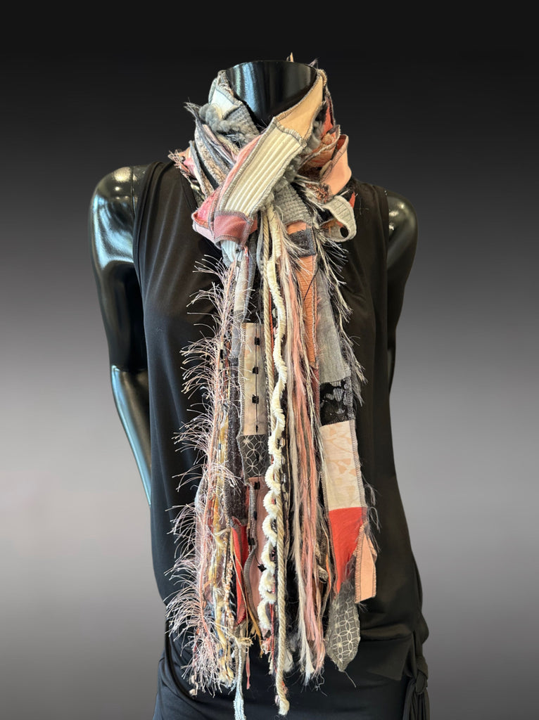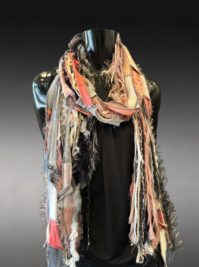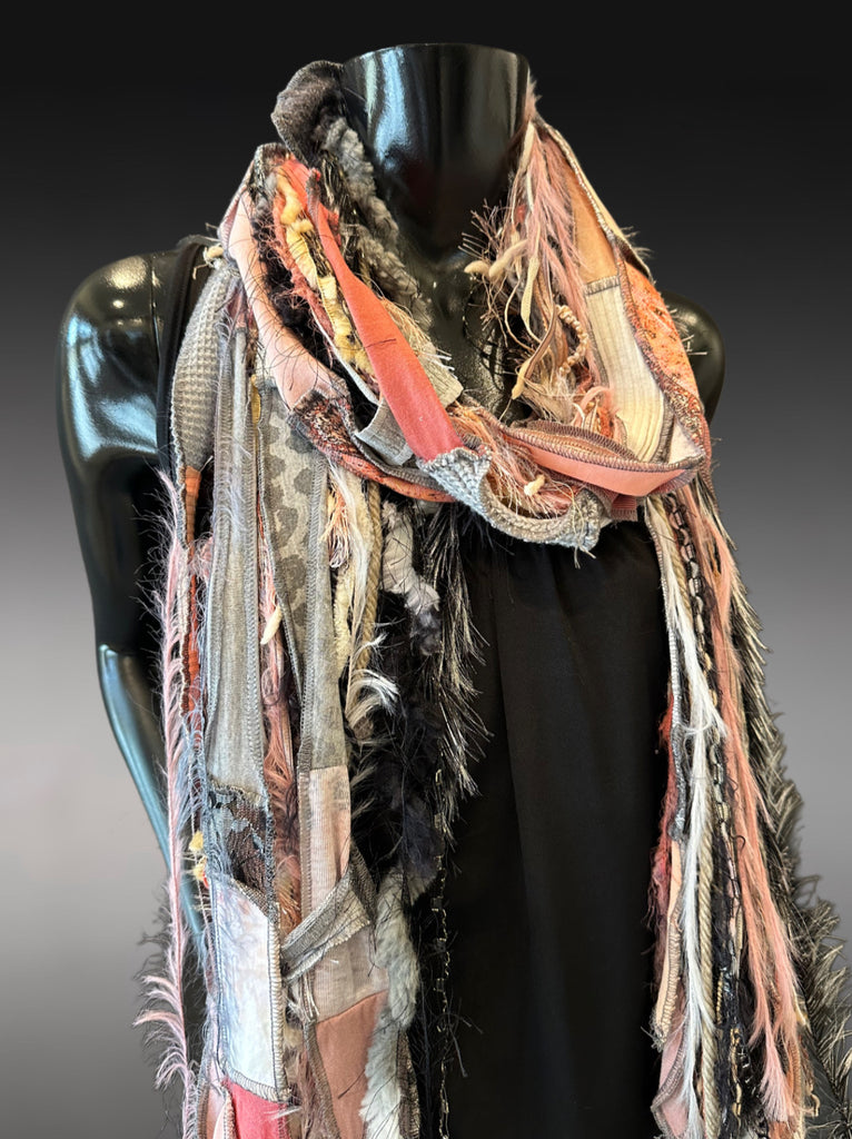 Handcrafted eco-couture scarf featuring layered textile artistry and rich, earthy tones. This one-of-a-kind statement scarf is created from reclaimed and specialty fabrics, including textured fibers, woven strips, and fringe elements, meticulously stitched into a sculptural, wearable art piece. Designed for dramatic drape and movement, it adds depth and individuality to any outfit while remaining lightweight and versatile. Perfect for lovers of artisan fashion, boho chic accessories, and sustainable clothing.