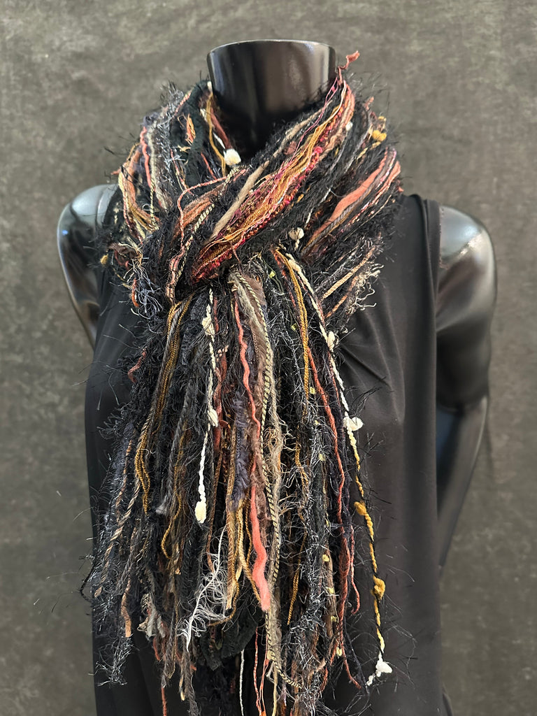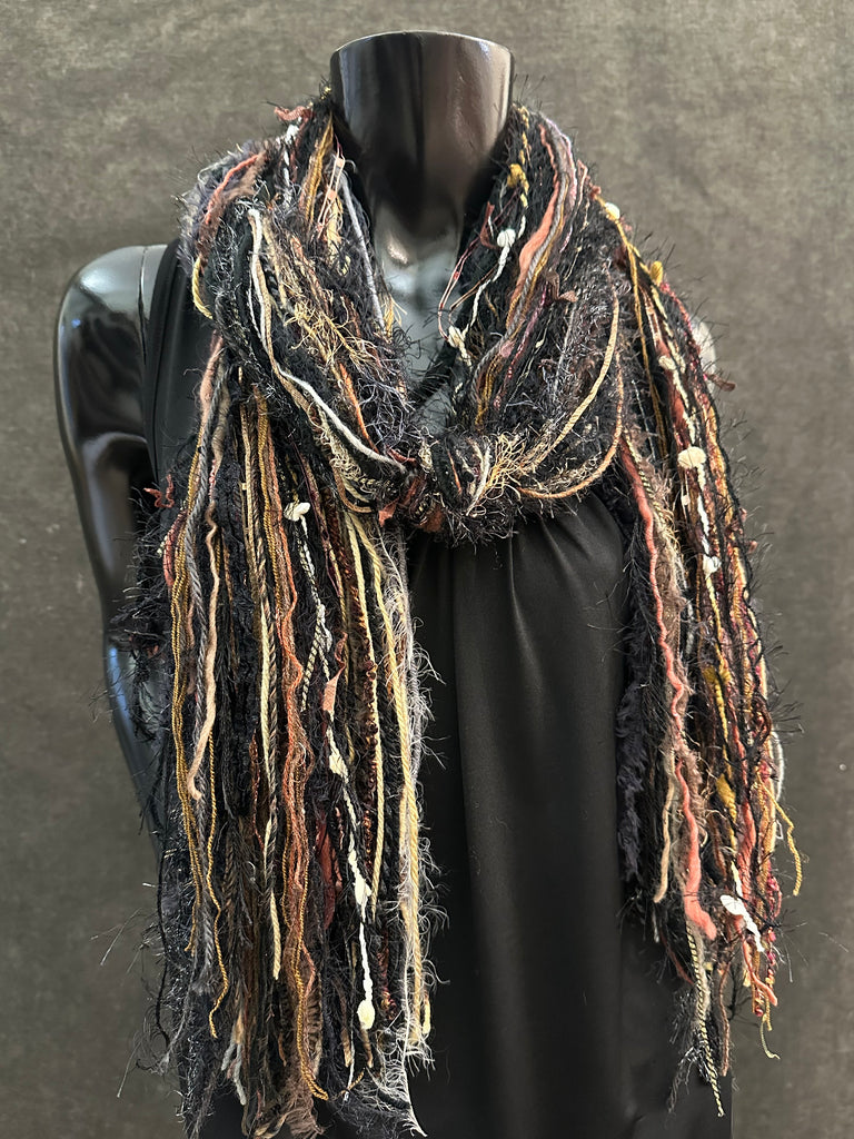 Long bohemian style scarf with art yarns and artful textures and fibers in a multicolor vibrant blend of black, blush shades, subtle peach, gray, medium mused rusty brown, taupe and hints of cream - perfect for all year styling and great with basic blacks. Perfect Harley rider accessory.