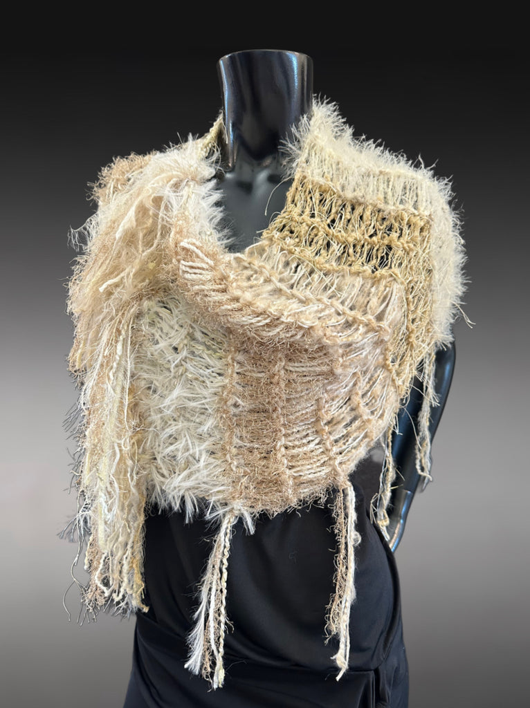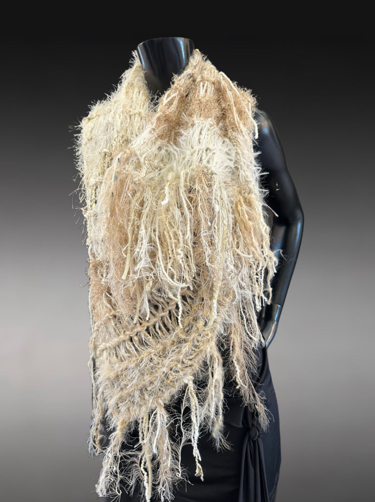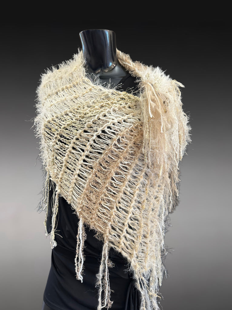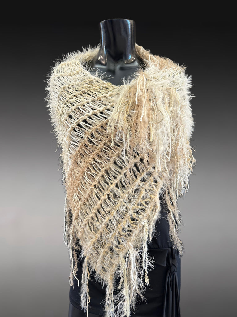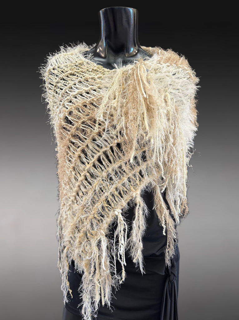 This pull over poncho is a classy, casual, artistic and shaggy art wear knit poncho great for all season wearing. It's a combination of 12 different fibers, artistic and unique - but simple and elegant, knit into a draping, flexible knit poncho that tapers to a tip with fringe around the perimeter edges plus an added section on the bias (diagonal). The colors are subtle and classy and knit is artsy! Includes unique novelty fibers and ribbons plus faux fur. Great for the bridal rehearsal dinner, with long skirts, jeans and boots, khaki cargo pants, over tank tops and all season styling.