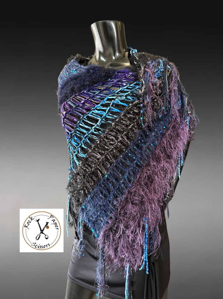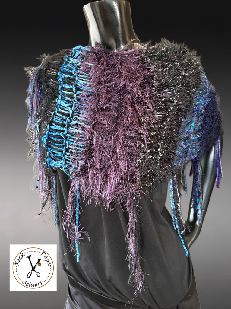 Hand knit Boho artistic cool jewel tone black purple aqua lavendar blue blend lightweight poncho or shoulder wrap in a pull-over style knit with art yarns and ribbons. The perfect bohemian fashion accessory. Hints of gray.