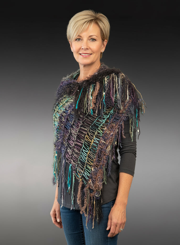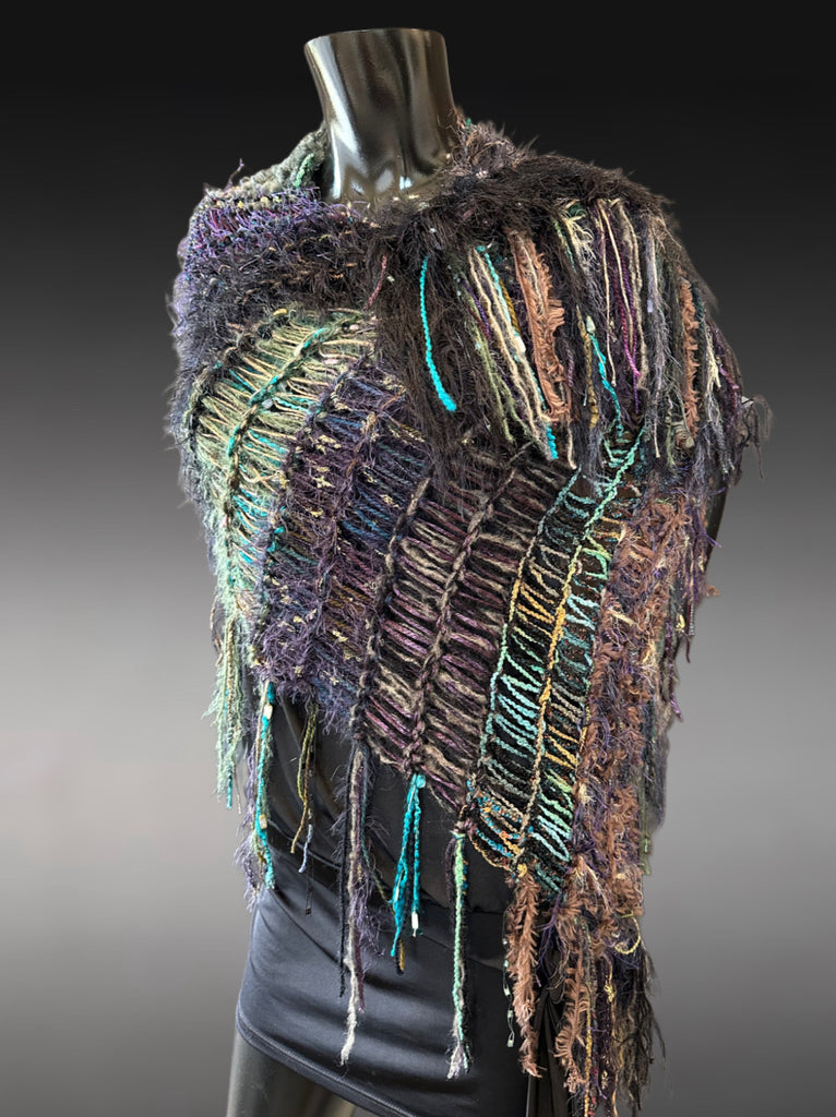 This couture, handmade knit indie poncho is an artistic, shaggy way to show your bohemian style! This pull-over shoulder wrap or poncho style piece is composed with carefully curated, unique and handmade fibers in saturated earth tones plus deep teal and greens and hints of black and taupes. It’s a collection of over 18 different materials, knit together in a drop knit shawl or poncho style, blended with a discontinued teal woven acrylic with unique tabs (hints of eggplant). Fibers are gathered from all over the world - so you have a unique piece! Includes hand spun and dyed fibers.
