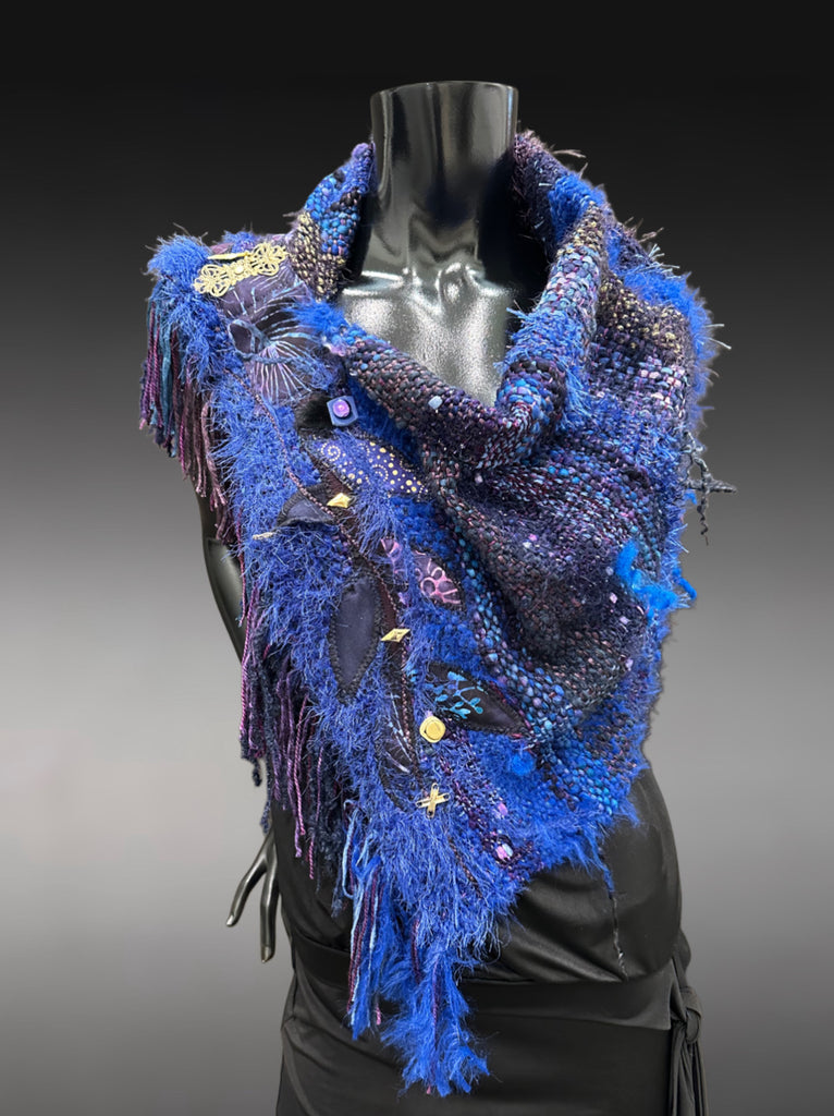 Woven artwear electric blue and purple jewel tone bohemian poncholette with snap closure and art yarns by rockpaperscissorsetc
