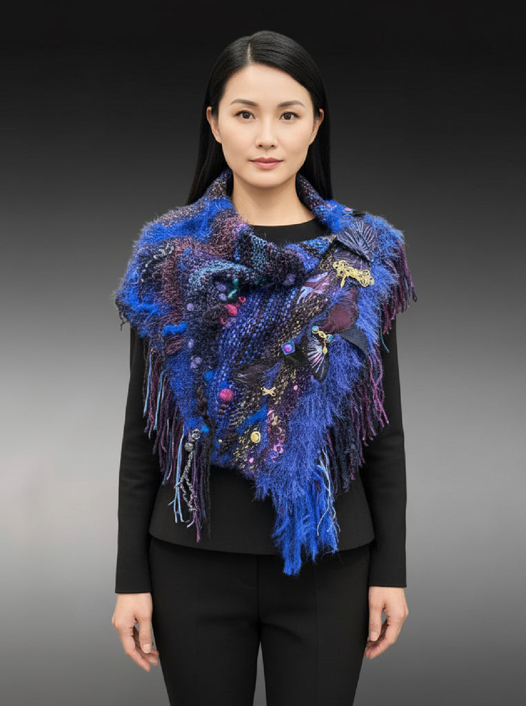 Saori style woven electric blue poncholette, bohemian or avant garde fashion shawl