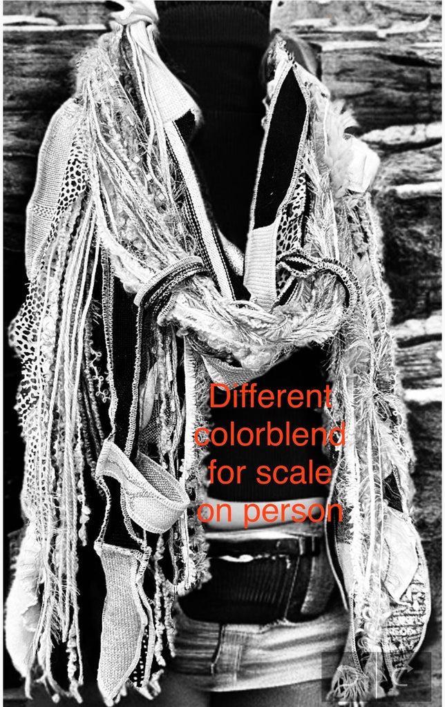 Two ties hold fibers together and are sewn to fibers. Fabric loops through r the piece give you styling options, to pull fibers and shreds together. Use the loops or simply ignore them and let them add dimension and texture.