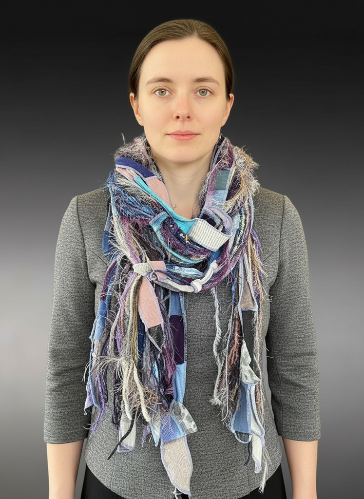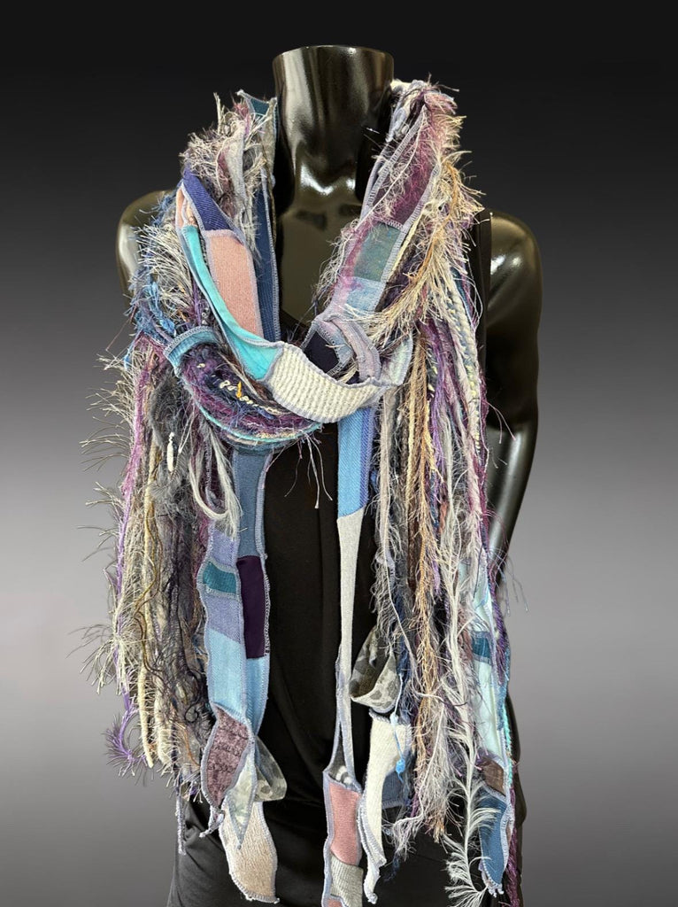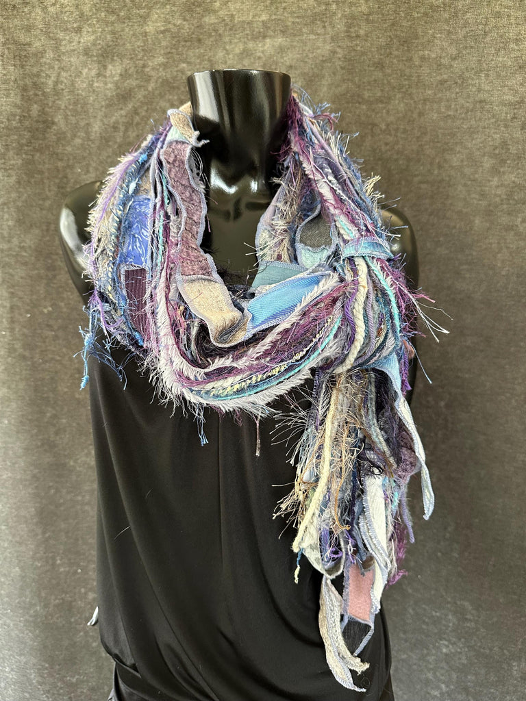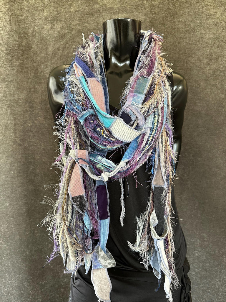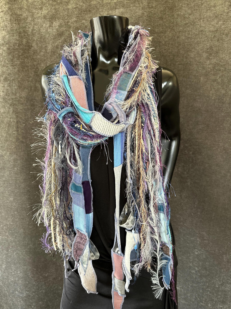 Boho neutral fiber fringe scarf with upcycyled fabric and art yarn in Lavender Blue Gray