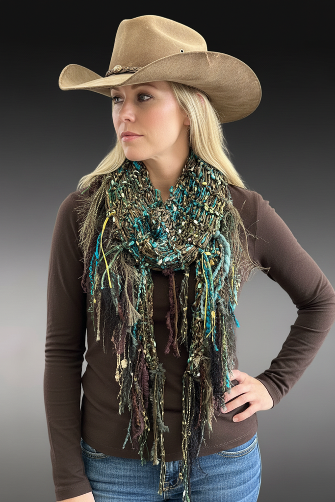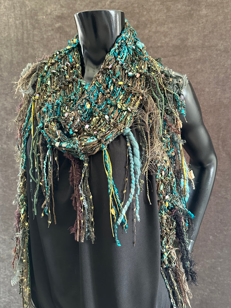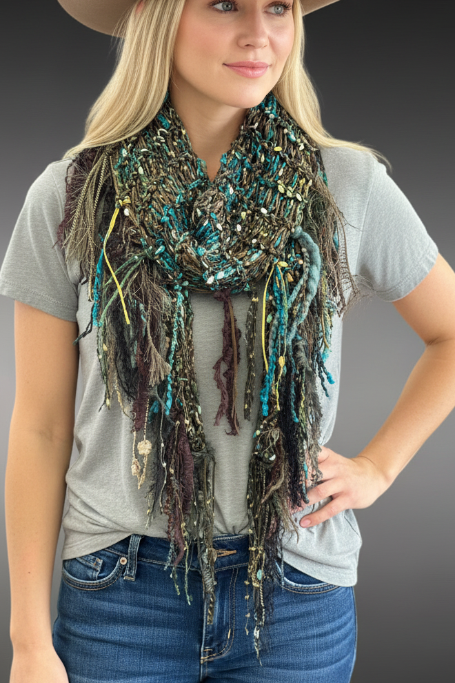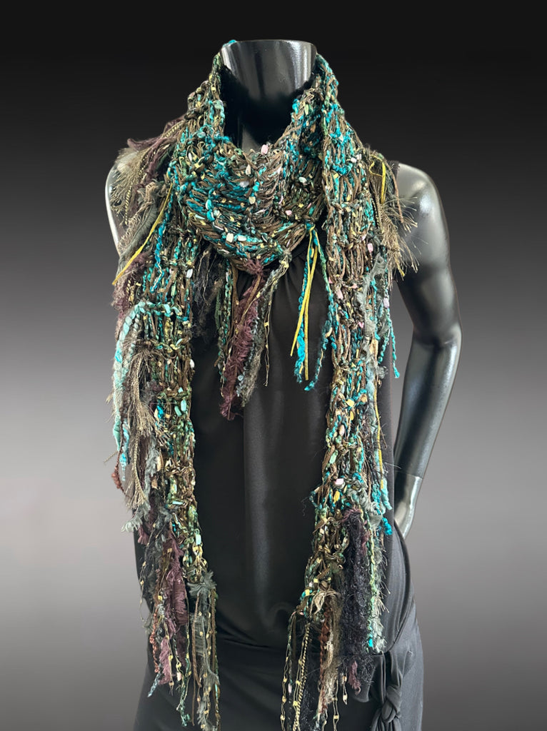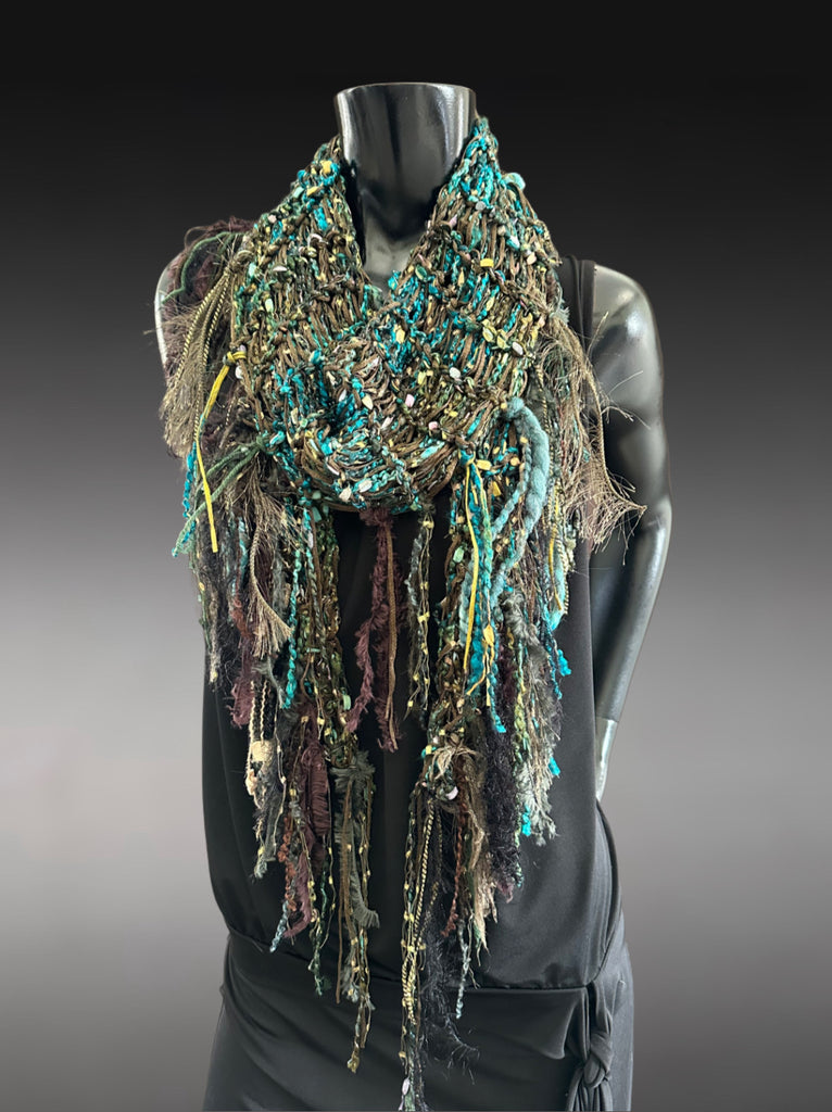 In the sea of manufactured items online, don't wear what others are wearing - be unique! Wear one of a kind! This is a great hand knit scarf with a woven acrylic base fiber that has silver woven in it. 3-ply base includes a unique woven acrylic, bronze tone shiny ribbon, plus a hand dyed ladder ribbon. Fringed edges include coordinating tones Fringe includes cotton, chenille, ribbon, faux fur and more.