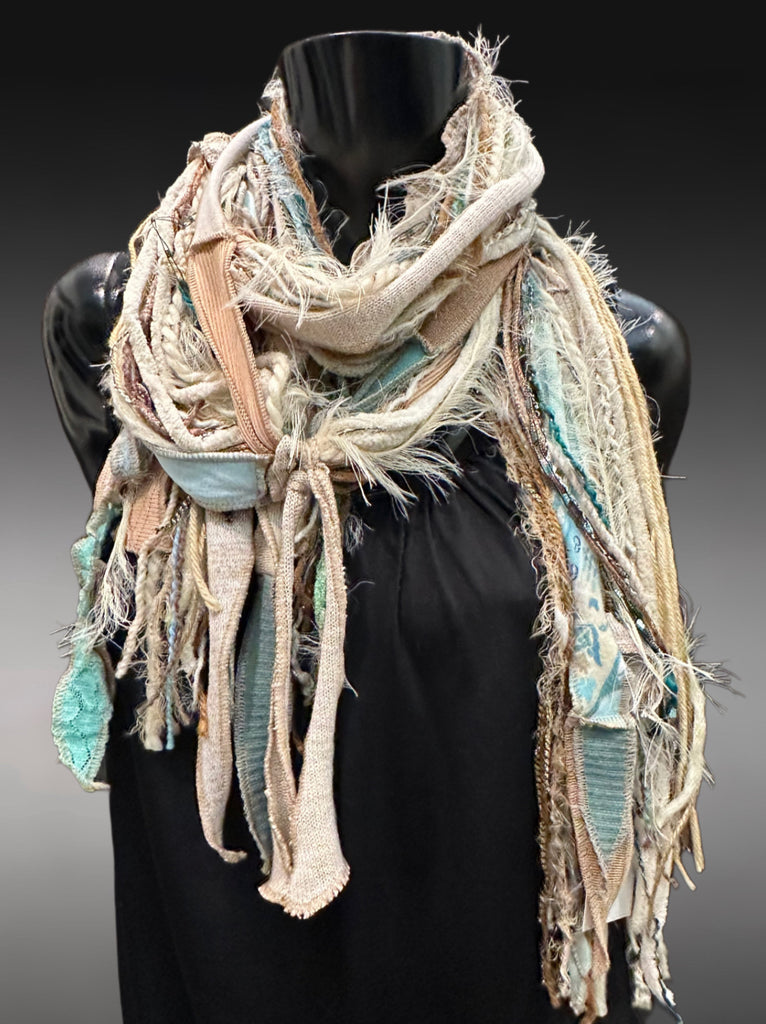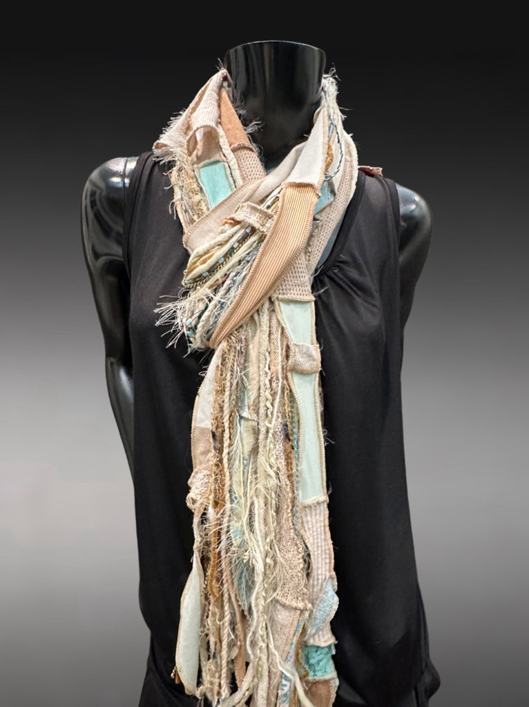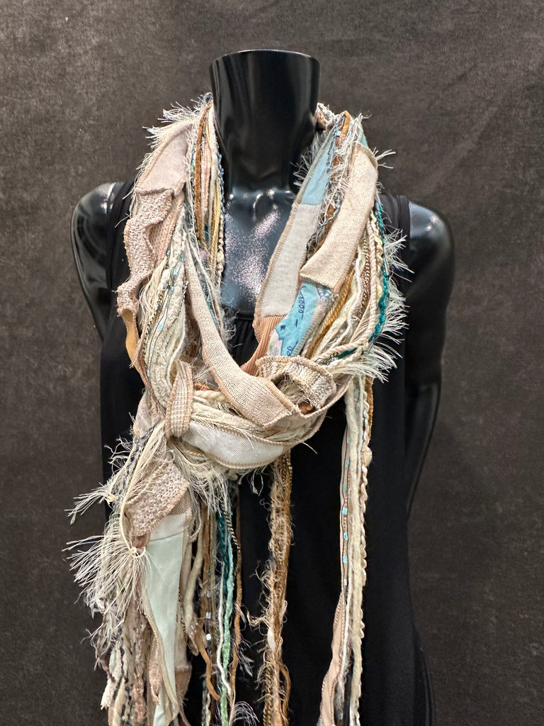 Unique handmade long artwear bohemian nature inspired scarf in neutrals of subtle beach-inspired aqua and light beige, cream, tan. Artsy fiber fringe scarf, tribal scarf, boho accessory, tribal fashion. Perfect easy women gifts!