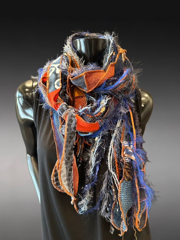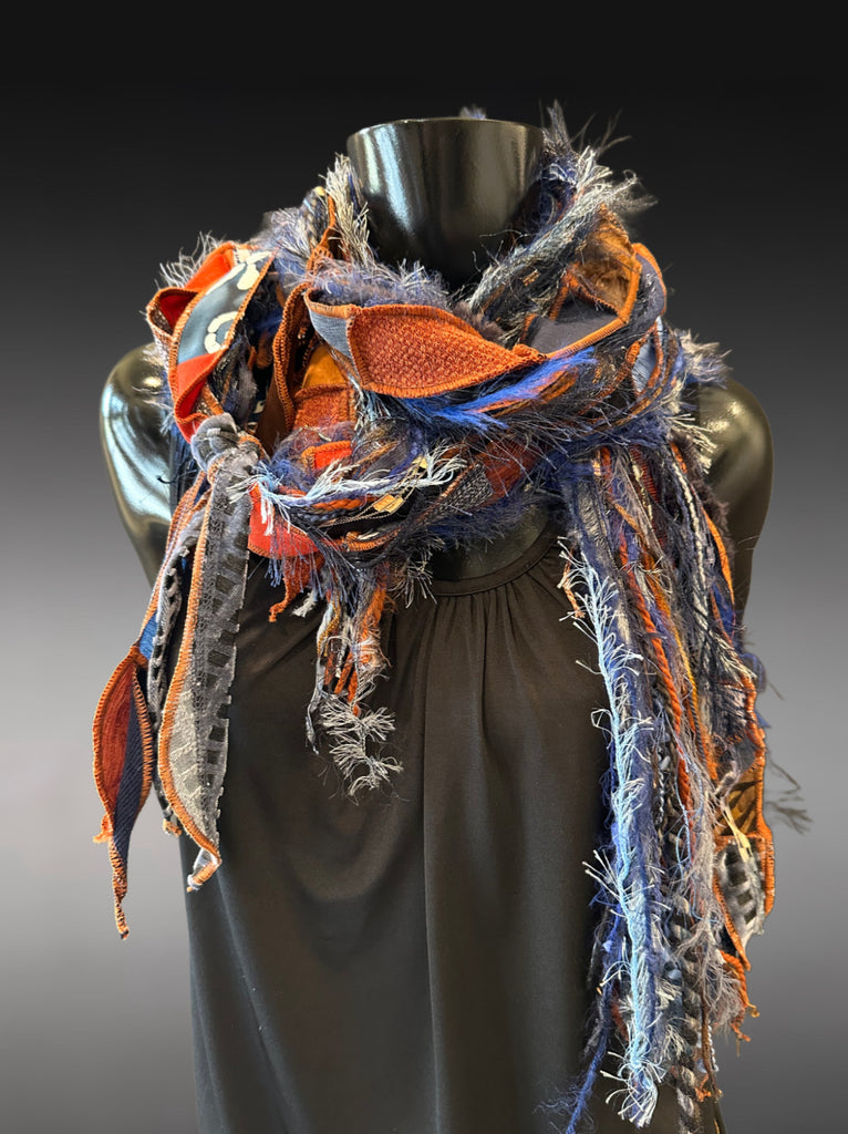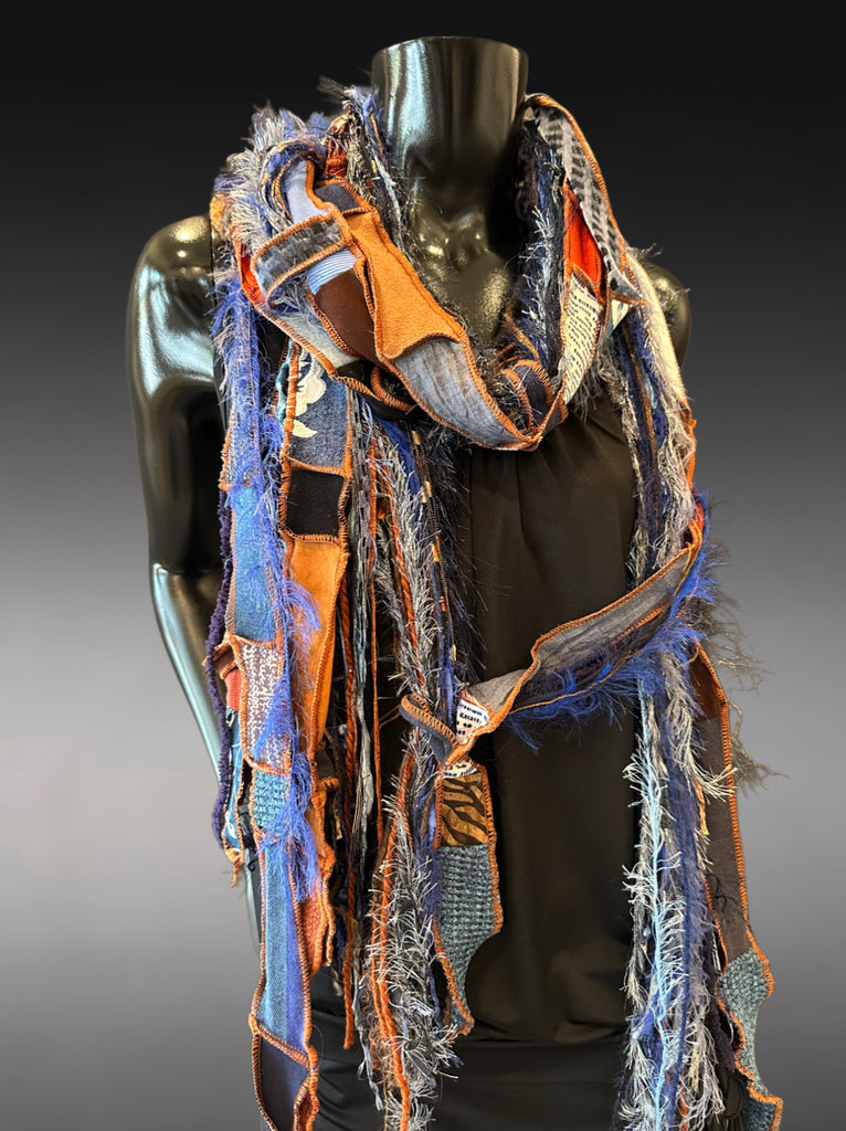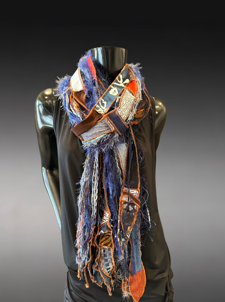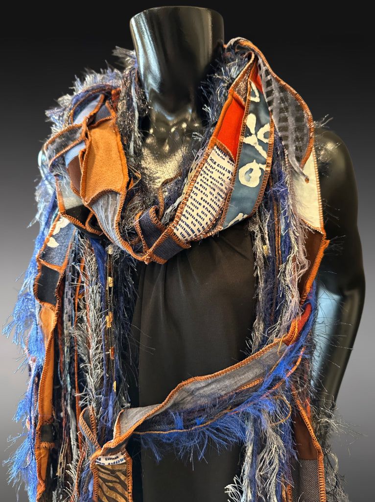 Bohemian and Avant garde blue brown orange couture eco friendly Scarf, bohemian style scarves, upcycled fashion
