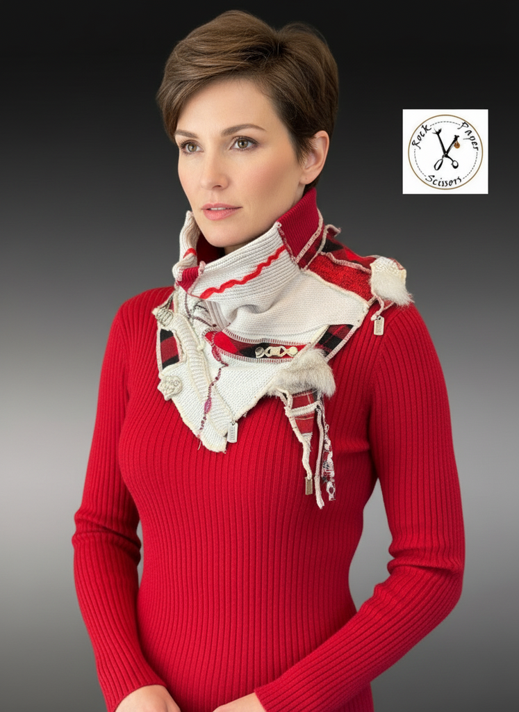 Statement refashion eco-friendly bold red and black fabric neck cowl with fun holiday northwoods plaid, buttons, charms, leather, and artistic details. Boho or artisan couture fashion style button up neck warmer with pops of plaid and patterns. Funky bold artistic fashion accessory in various fabrics and knits a couture shape with unique charms and embellishments. Reversible with different details on front and back depending whether you have the buttons on the left or right side of your neck. Fabrics are a blend of cotton blend, knits, nylon and polyester soft fabrics. Includes tidbits of white bunny fur. One of a kind. No wool.