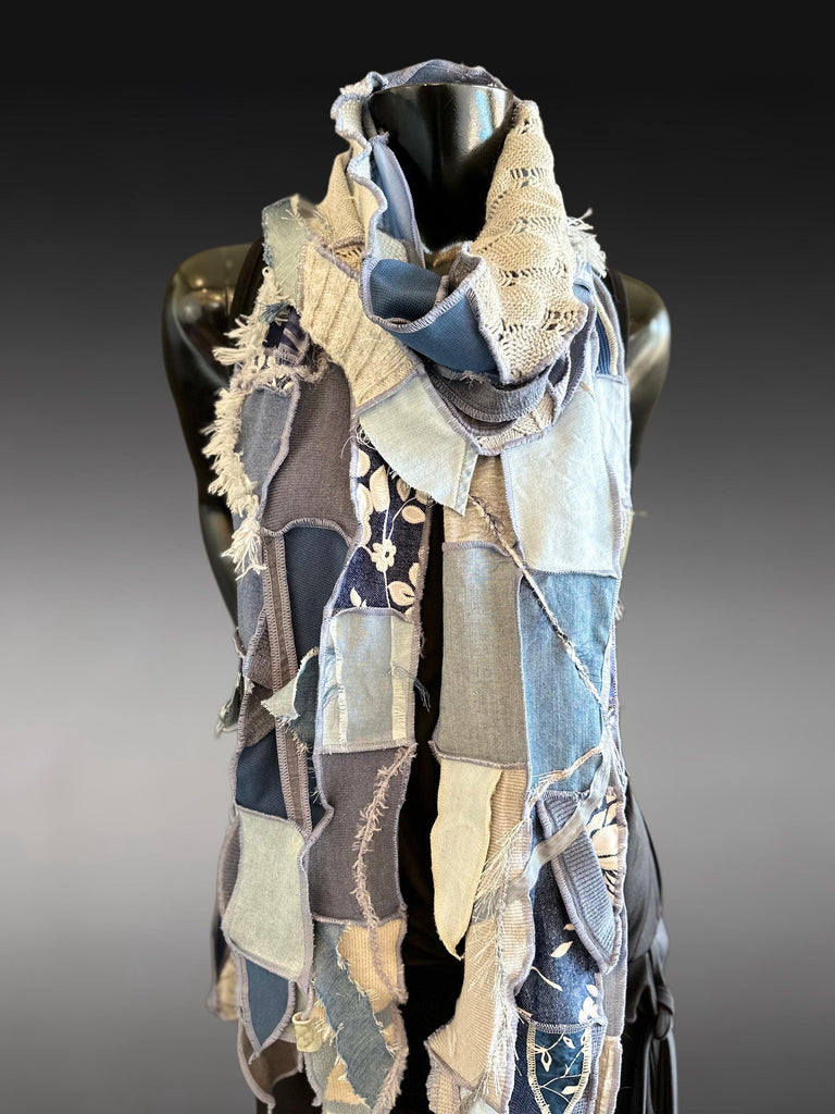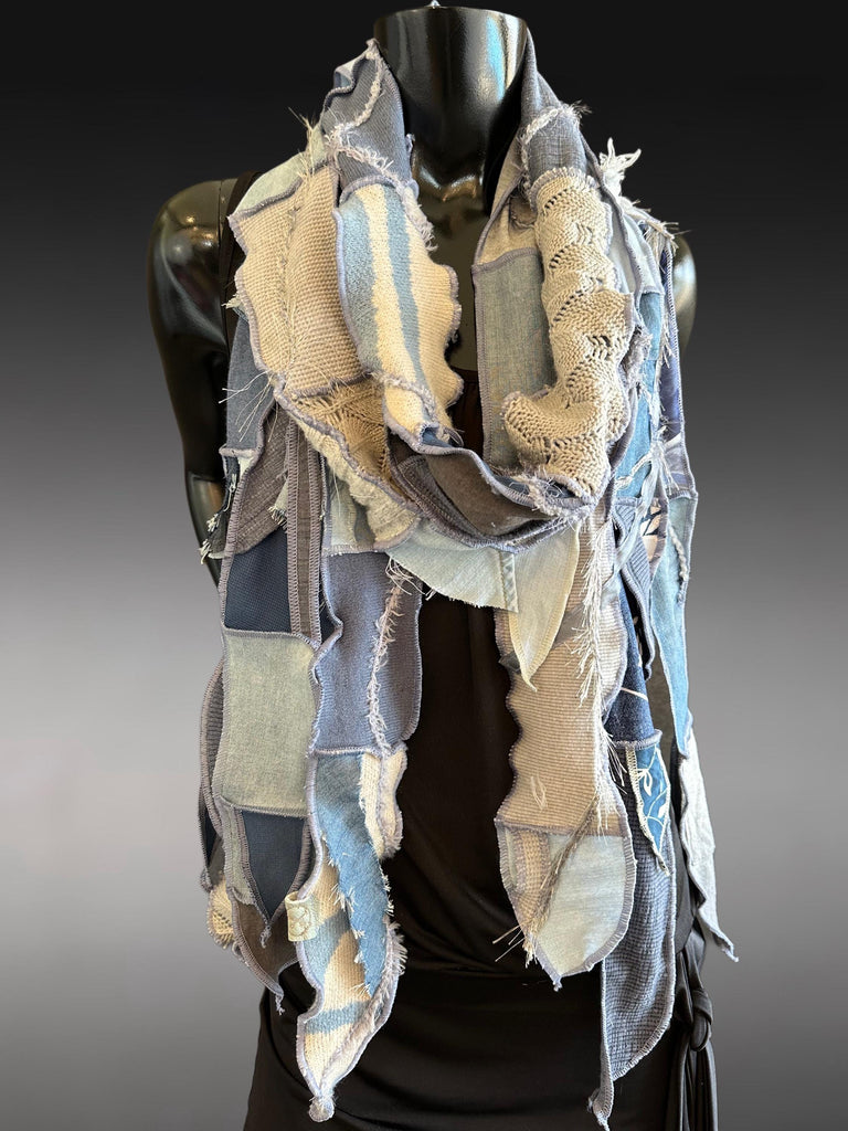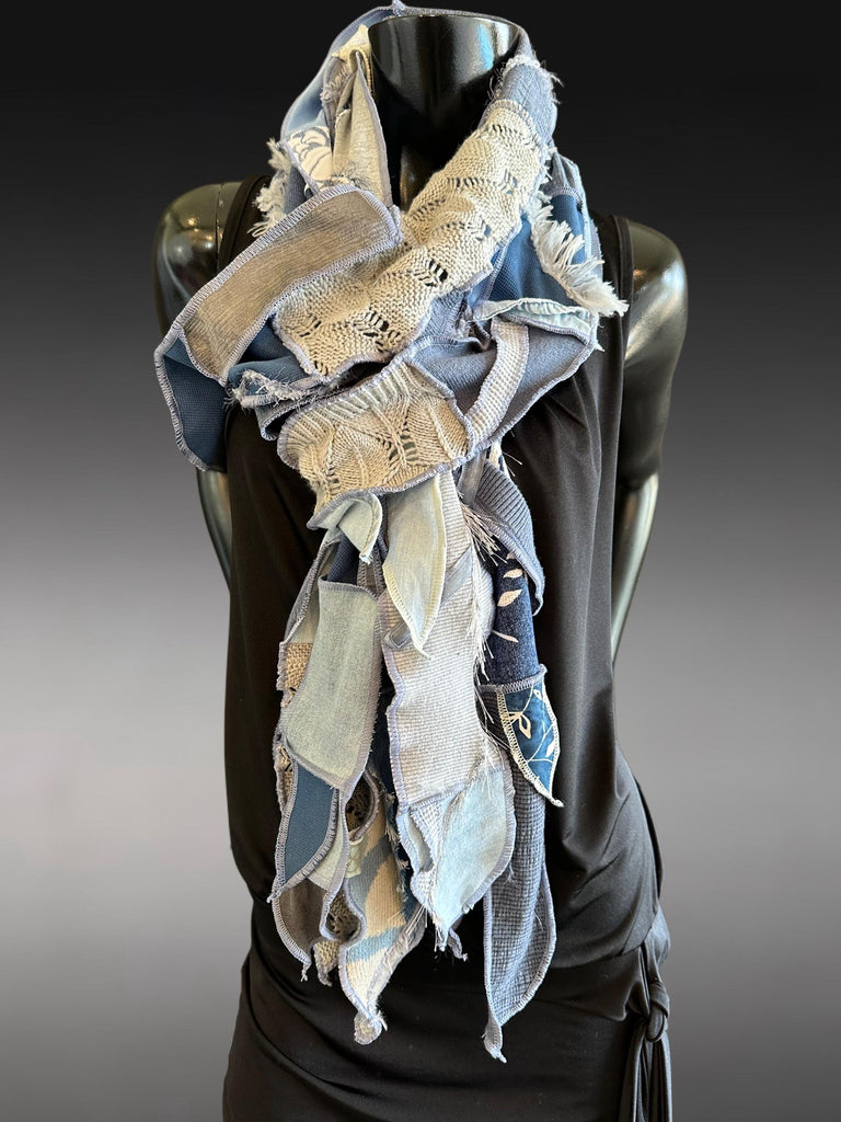 “Shreds” series Freeform eco-friendly scarf - blue jean, blues, creams and gray artisan fabric scarf. Medium width version at approximately 8’ long x 12-14” wide. The variety of prints and textures makes this artsy and fun, yet casual. Includes plush knit fabrics, ribbed fabric, Lightweight and plush knits, jean material, knit lace, designer fabrics, jean, tshirt fabric, sweater and more for softness and warmth. Perfect with any simple top, wears great with a winter coat or jean jacket.